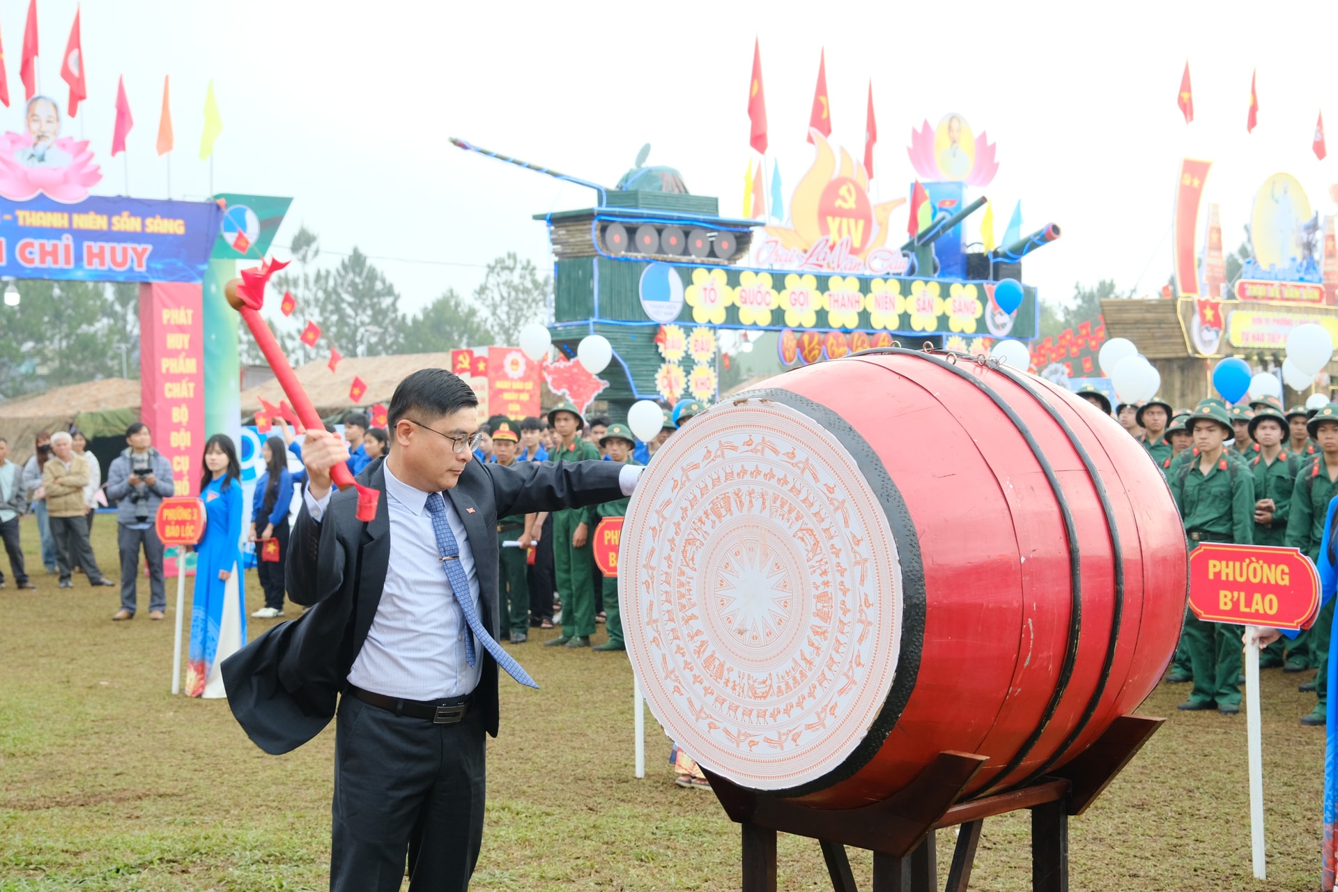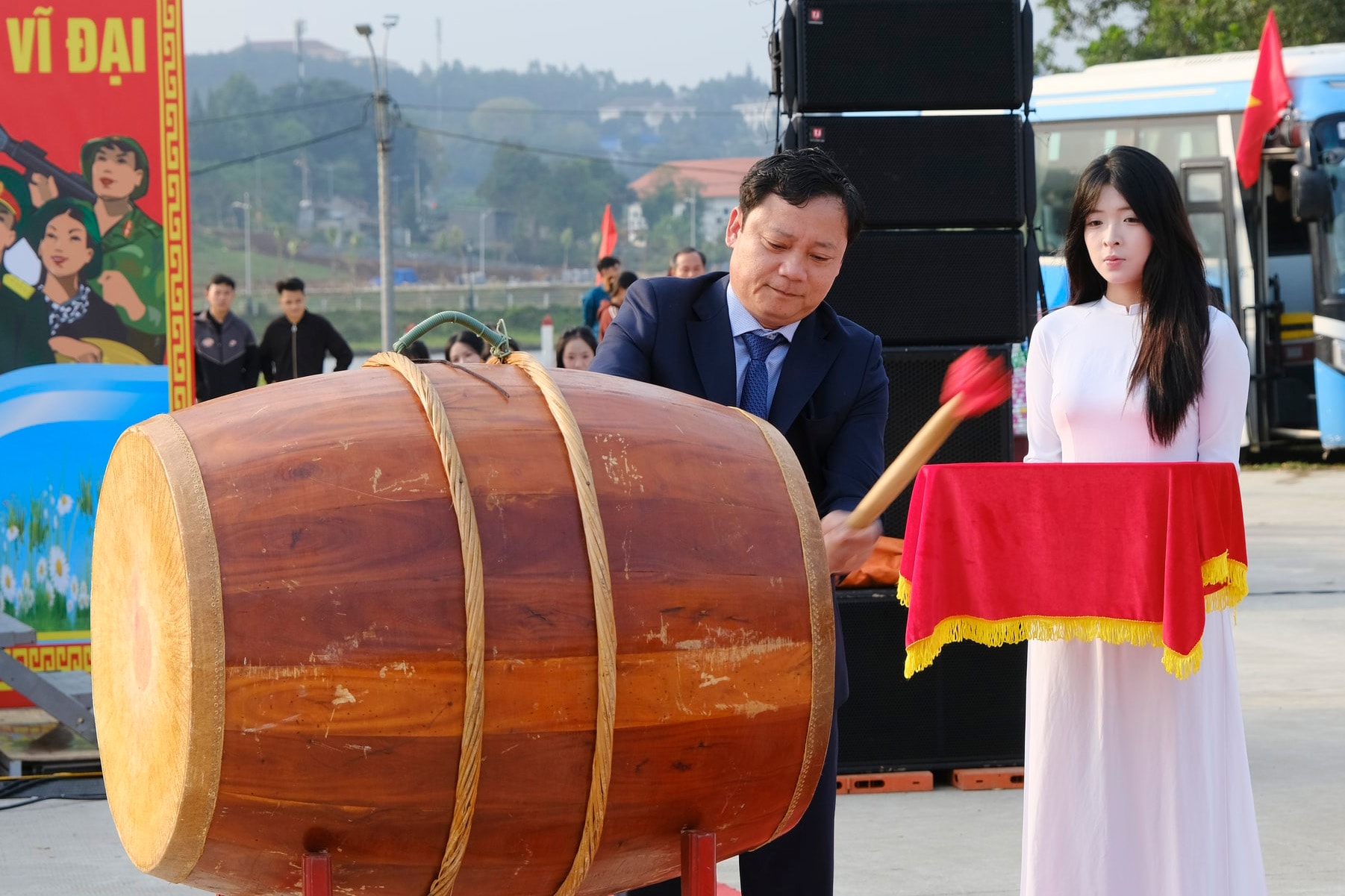 Đồng chí Nguyễn Khắc Bình, Ủy viên Ban Thường vụ Tỉnh ủy, Chánh Văn phòng Tỉnh ủy đã đánh trống mở hội giao quân. Tiếng trống hội rộn ràng, sắc cờ đỏ thắm hòa cùng ánh mắt tự hào của gia đình, người thân đã tạo nên một ngày hội tòng quân thật sự ý nghĩa.
