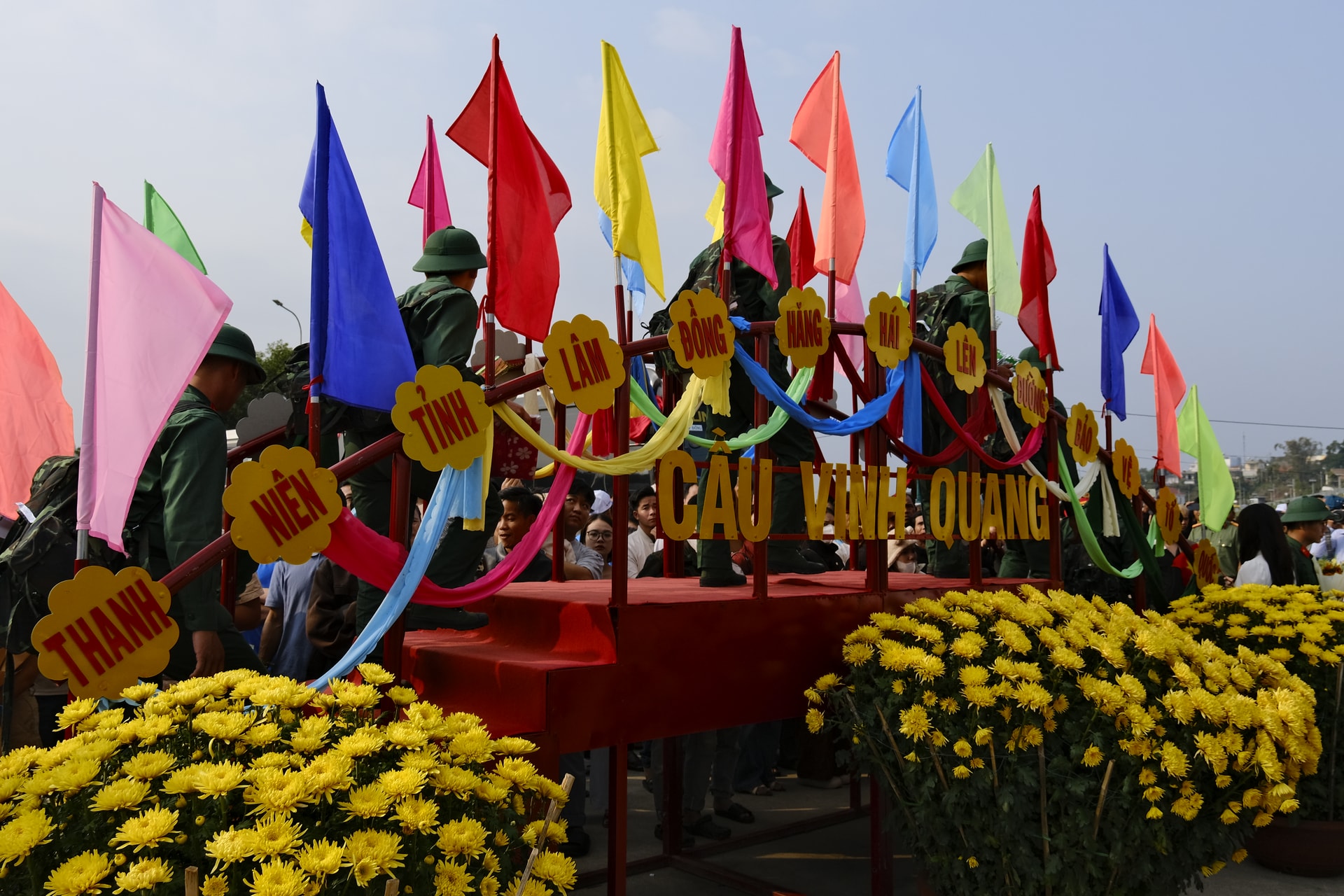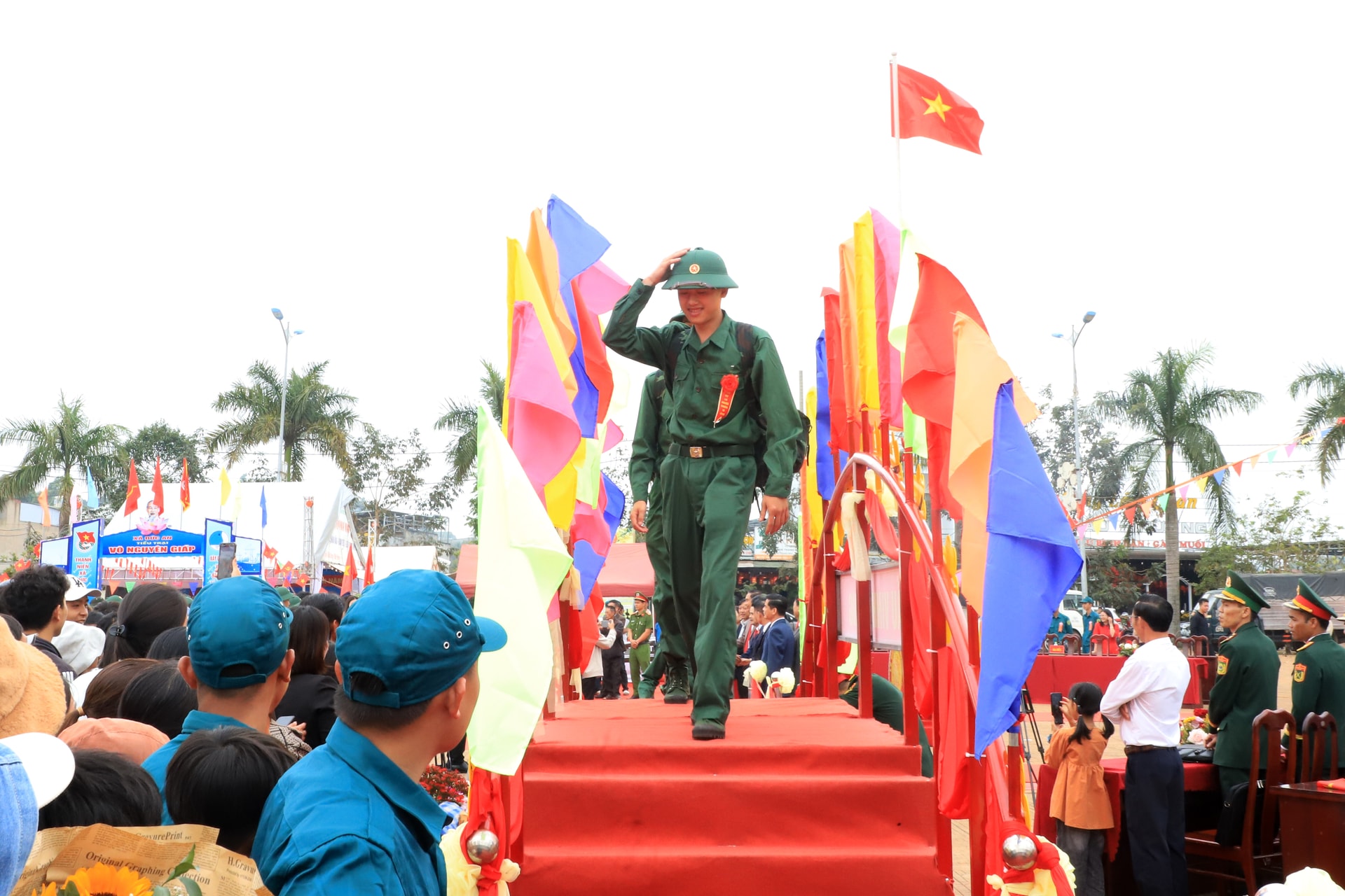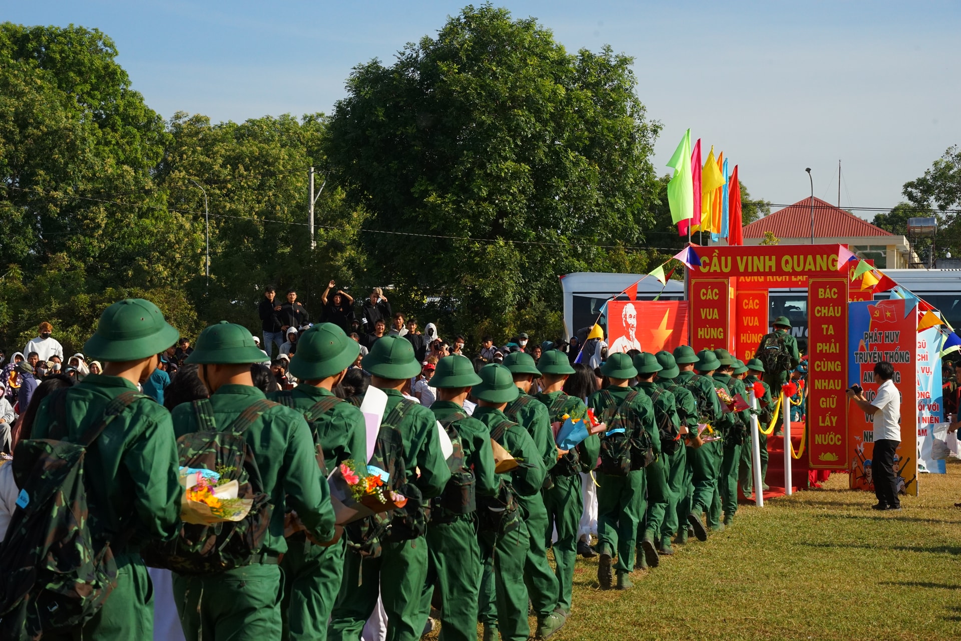 Thanh niên nhập ngũ bước qua Cầu Vinh quang