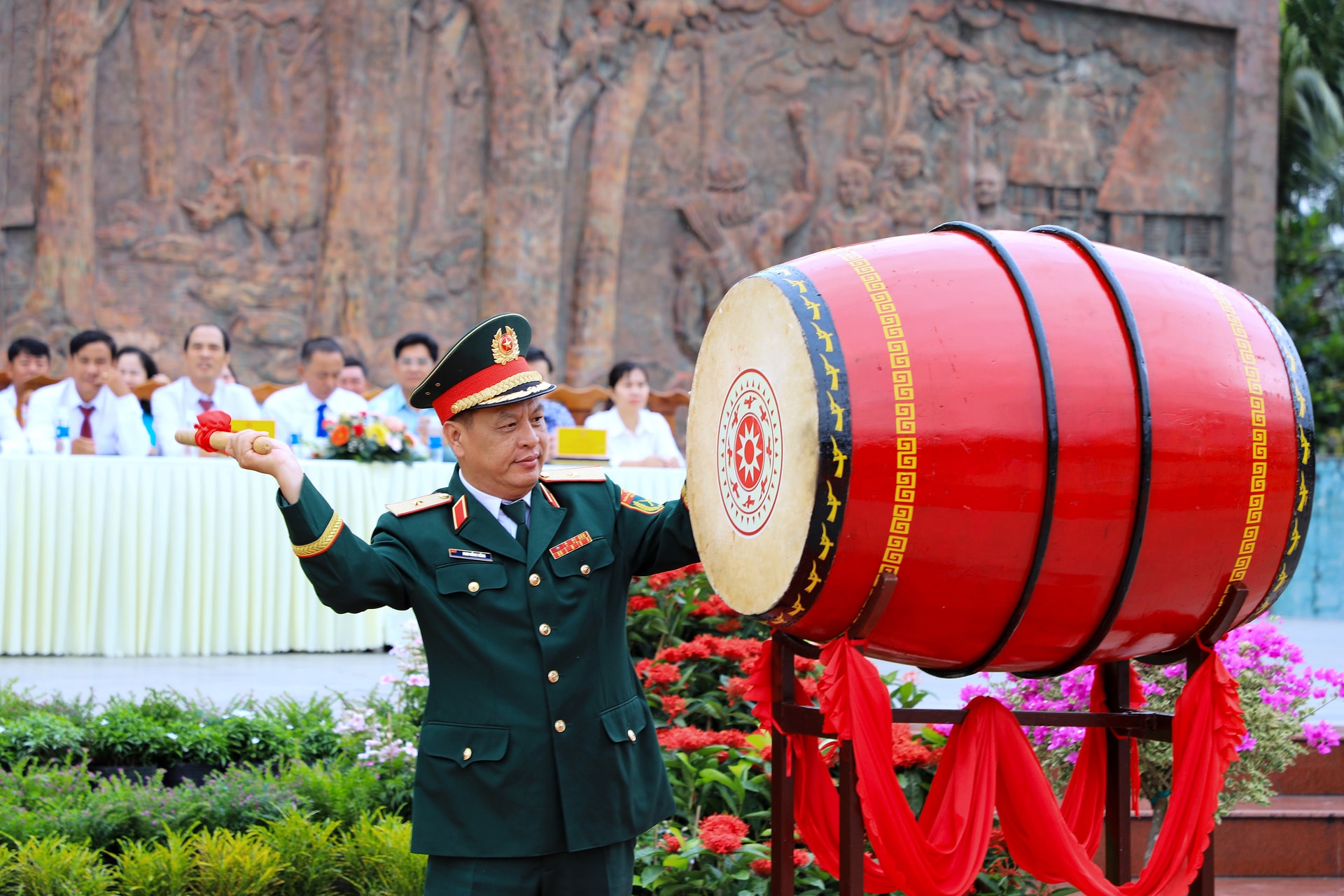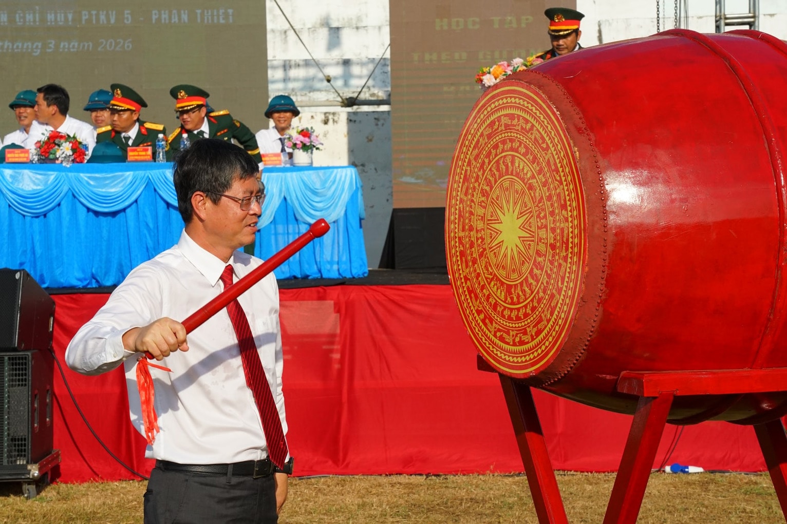 Đồng chí Hồ Văn Mười, Ủy viên Ban Chấp hành Trung ương Đảng, Phó Bí thư Tỉnh ủy, Chủ tịch UBND tỉnh Lâm Đồng nổi trống hội khai quân tại điểm giao nhận quân số 01 - Ban Chỉ huy PTKV 1 - Đức Trọng