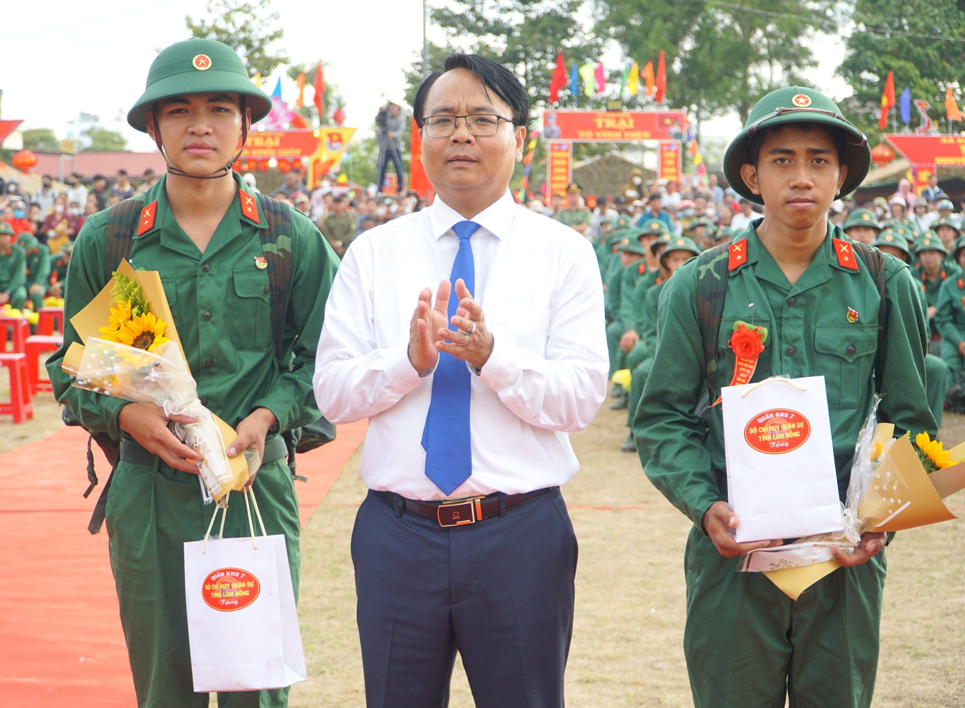 Đồng chí Hồ Văn Mười, Ủy viên Ban Chấp hành Trung ương Đảng, Phó Bí thư Tỉnh ủy, Chủ tịch UBND tỉnh Lâm Đồng tặng hoa chúc mừng tân binh lên đường nhập ngũ tại Điểm giao nhận quân số 01 - Ban Chỉ huy PTKV 1 - Đức Trọng