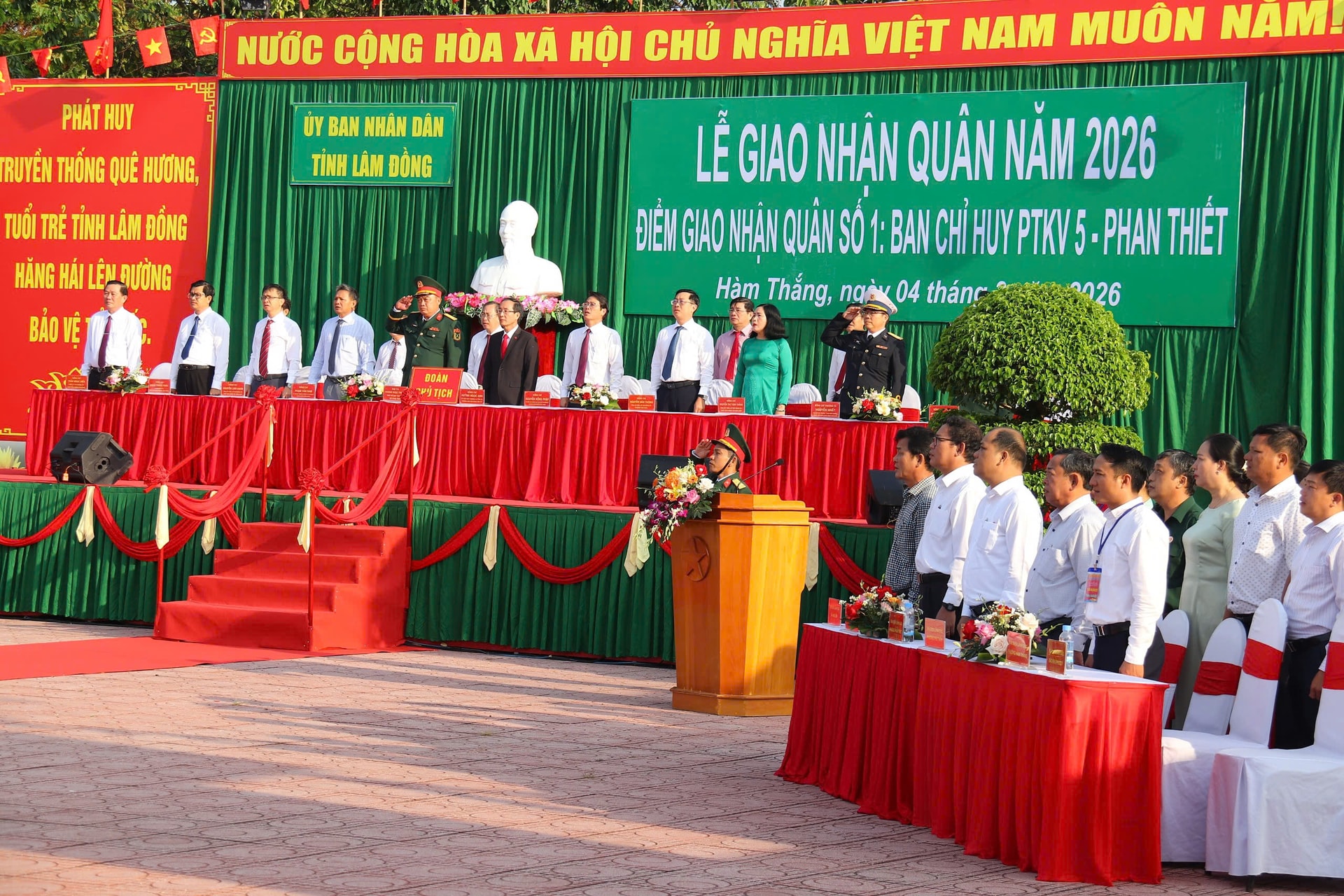 Tại buổi lễ, lãnh đạo Ban Chỉ huy Phòng thủ Khu vực 5 - Phan Thiết đã công bố Quyết định của Chủ tịch UBND tỉnh Lâm Đồng về giao chỉ tiêu gọi công dân nhập ngũ vào Quân đội và Công an nhân dân năm 2026 cho các địa phương.