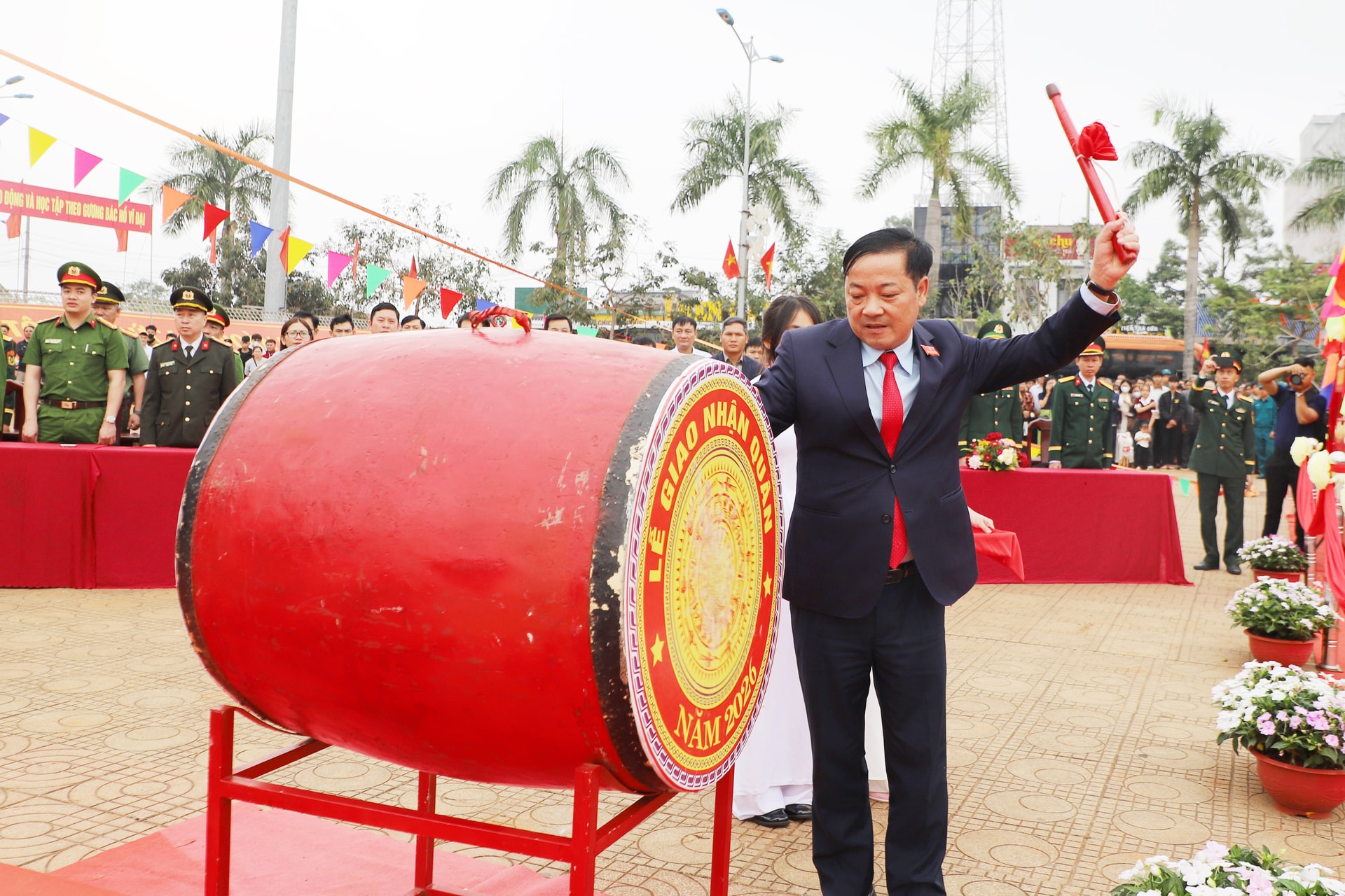 Thiếu tướng Đinh Hồng Tiếng, Ủy viên Ban Thường vụ Tỉnh ủy, Chỉ huy trưởng Bộ CHQS tỉnh Lâm Đồng đã nổi hồi trống mở hội giao quân.