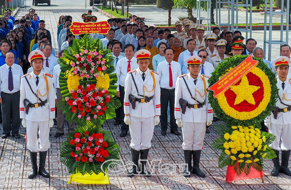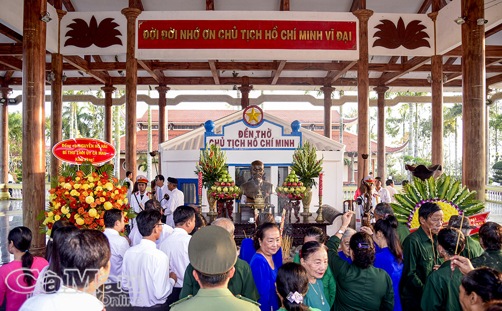 * Tại phường An Xuyên, trong Khu tưởng niệm Chủ tịch Hồ Chí Minh và Đền thờ 10 anh hùng liệt sĩ khởi nghĩa Hòn Khoai và Nghĩa trang Liệt sĩ tỉnh, đoàn đại biểu đã dành phút mặc niệm thiêng liêng, đồng thời thực hiện nghi lễ dâng hoa, dâng hương lên Bác Hồ tại khu tưởng niệm Người và Tượng đài Tổ quốc ghi công, bày tỏ lòng biết ơn sâu sắc đối với Chủ tịch Hồ Chí Minh - lãnh tụ vĩ đại của dân tộc Việt Nam và các anh hùng liệt sĩ đã anh dũng hy sinh vì sự nghiệp giải phóng dân tộc, thống nhất đất nước, xây dựng quê hương Cà Mau ngày càng giàu đẹp.