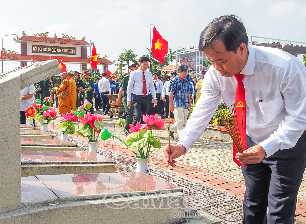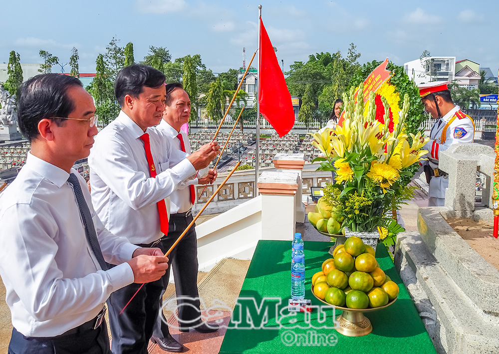 Trong không khí trang nghiêm, lãnh đạo Tỉnh ủy, HĐND, UBND, Ủy ban MTTQ Việt Nam tỉnh Cà Mau dâng hương các anh hùng liệt sĩ tại Nghĩa trang Liệt sĩ tỉnh.