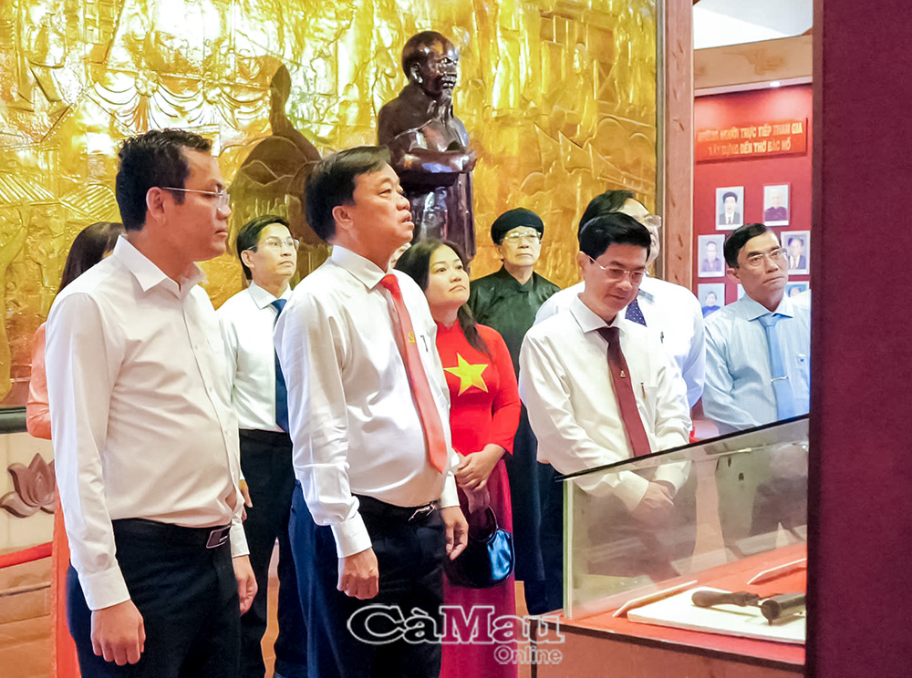 Phó Bí thư Thường trực Tỉnh ủy Huỳnh Quốc Việt (thứ 2 từ trái sang) cùng lãnh đạo tỉnh tham quan Nhà trưng bày cuộc đời, sự nghiệp cách mạng của Chủ tịch Hồ Chí Minh.