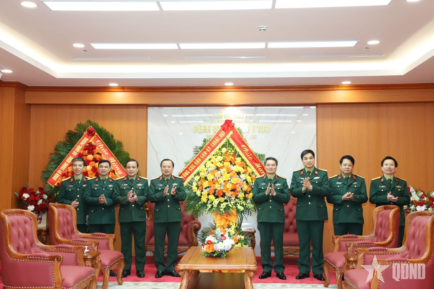 Thiếu tướng Phùng Ngọc Sơn, Phó chủ nhiệm, Tham mưu trưởng Tổng cục Hậu cần-Kỹ thuật và đoàn công tác tặng hoa chúc mừng Bệnh viện Quân y 103.