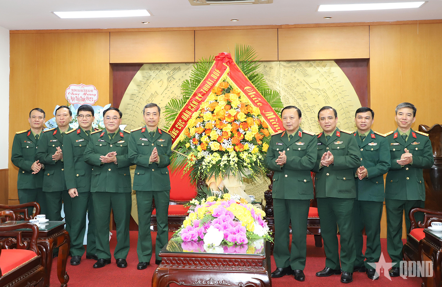 Thiếu tướng Phùng Ngọc Sơn, Phó chủ nhiệm, Tham mưu trưởng Tổng cục Hậu cần-Kỹ thuật và đoàn công tác tặng hoa chúc mừng Học viện Quân y.