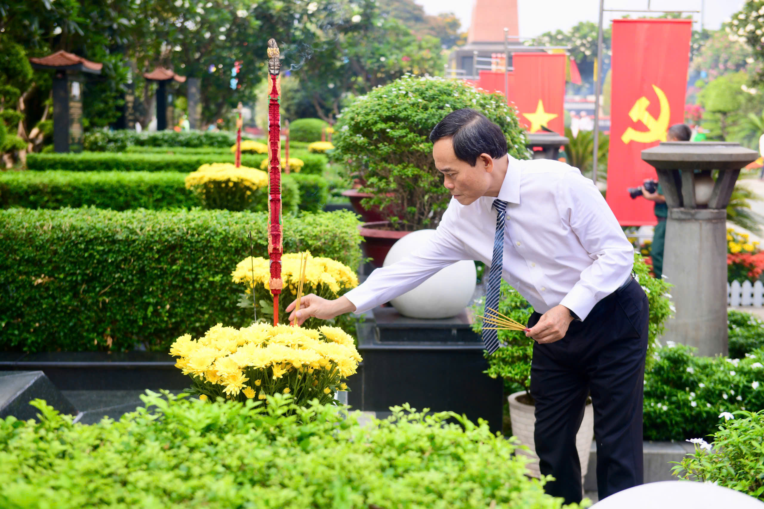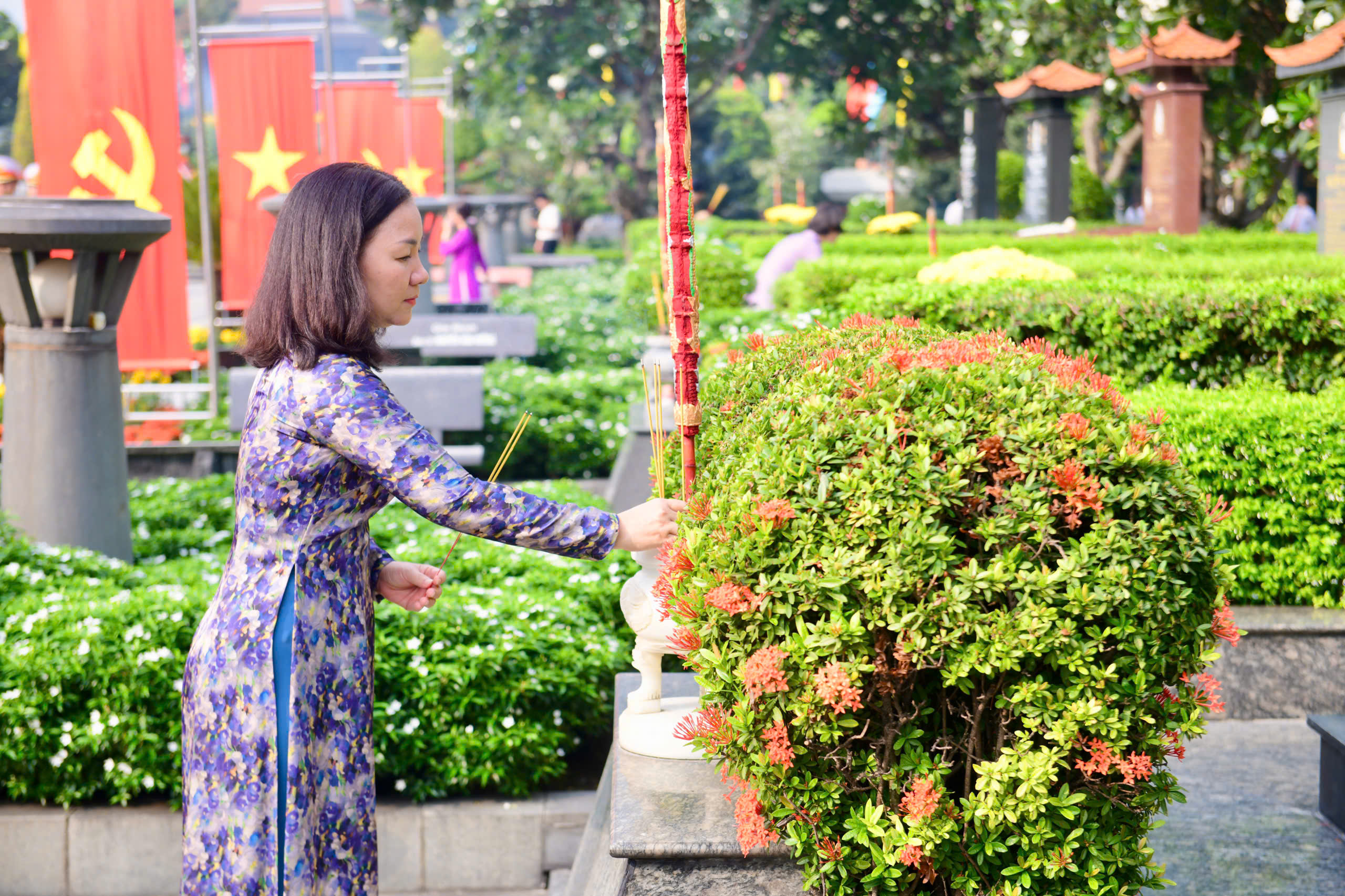 Đoàn đại biểu do Bí thư Thành ủy TP.HCM dẫn đầu cũng đến dâng hương, dâng hoa tại Nghĩa trang Liệt sĩ TP.HCM (phường Long Bình), bày tỏ lòng biết ơn sâu sắc với công lao của các Mẹ Việt Nam anh hùng, các Anh hùng liệt sĩ, những người đã hy sinh cho độc lập, tự do của Tổ quốc.