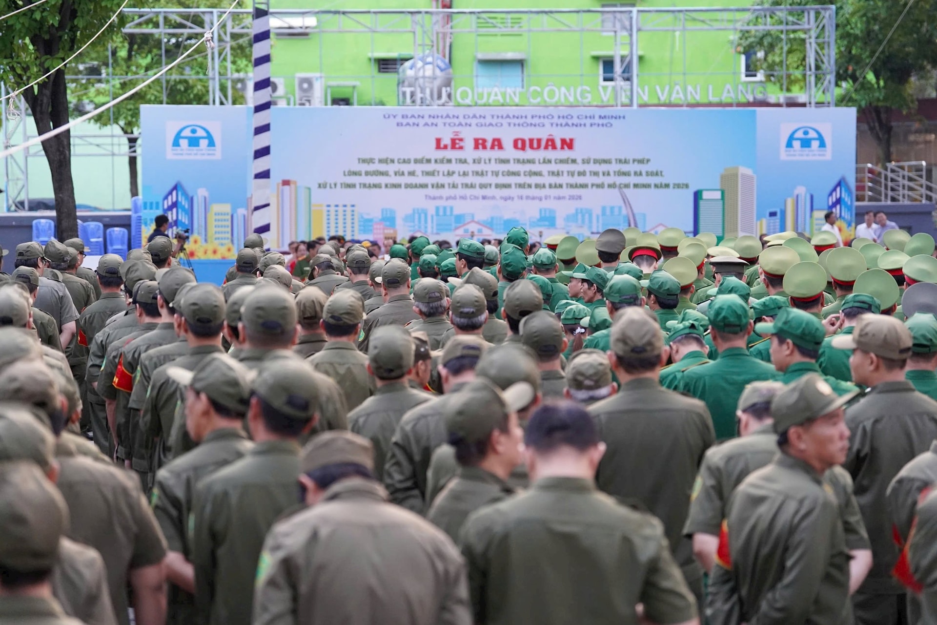 Sáng 16/1, tại Công viên Văn Lang, phường An Đông, TP.HCM, Ban An toàn giao thông TP.HCM tổ chức Lễ ra quân cao điểm kiểm tra, xử lý tình trạng lấn chiếm, sử dụng trái phép lòng đường, vỉa hè; thiết lập lại trật tự công cộng, trật tự đô thị và tổng rà soát, xử lý hoạt động kinh doanh vận tải trái quy định trên địa bàn TP.HCM năm 2026.