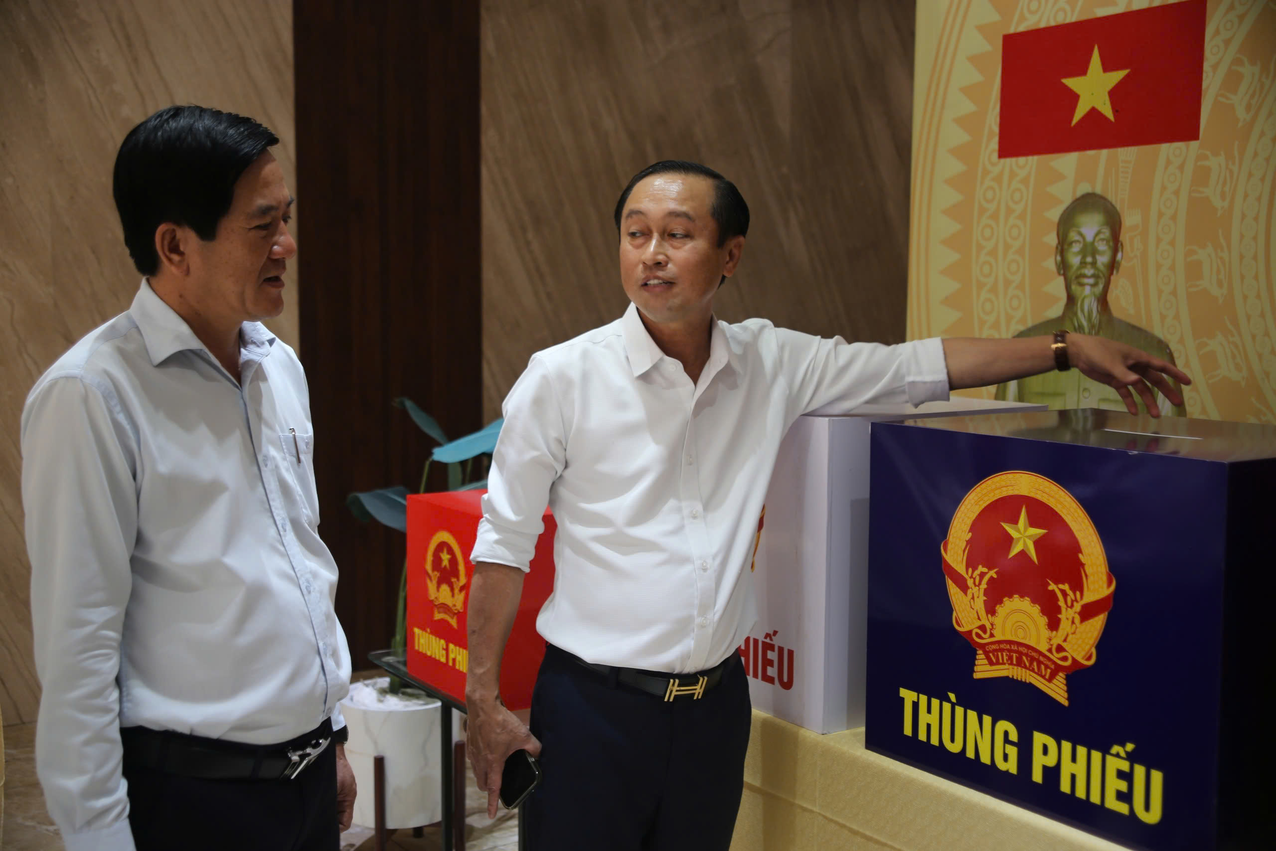 Ông Huỳnh Thanh Nhân, Phó Chủ tịch HĐND TP.HCM (bên trái), kiểm tra công tác chuẩn bị bầu cử tại điểm bỏ phiếu chung cư Opal, phường Dĩ An, sáng 13-3. Ảnh: PHẠM HẢI