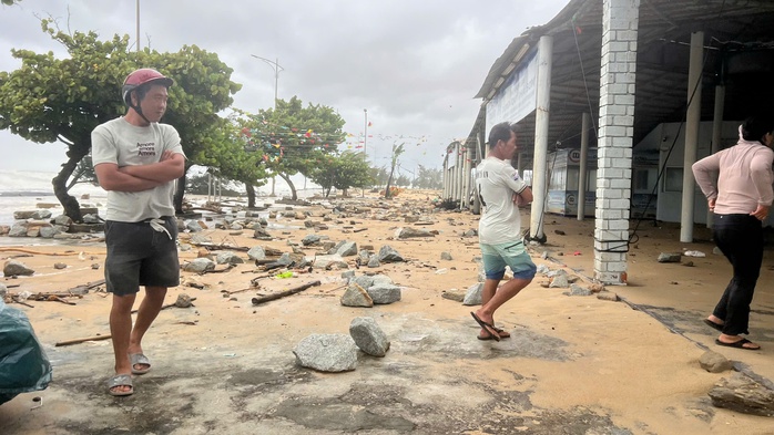 Ông Lê Đình Phong, Chủ tịch UBND phường Thuận An, cho biết tuyến bờ biển qua phường dài khoảng 17 km, nhiều đoạn chưa được kè kiên cố nên mỗi khi mưa bão, sóng biển lại xâm thực nặng nề hơn. Những ngày qua, do ảnh hưởng hoàn lưu bão Fengshen, sóng lớn tiếp tục đánh sâu vào bờ, cuốn cả những tảng đá lớn, gây thêm sạt lở.