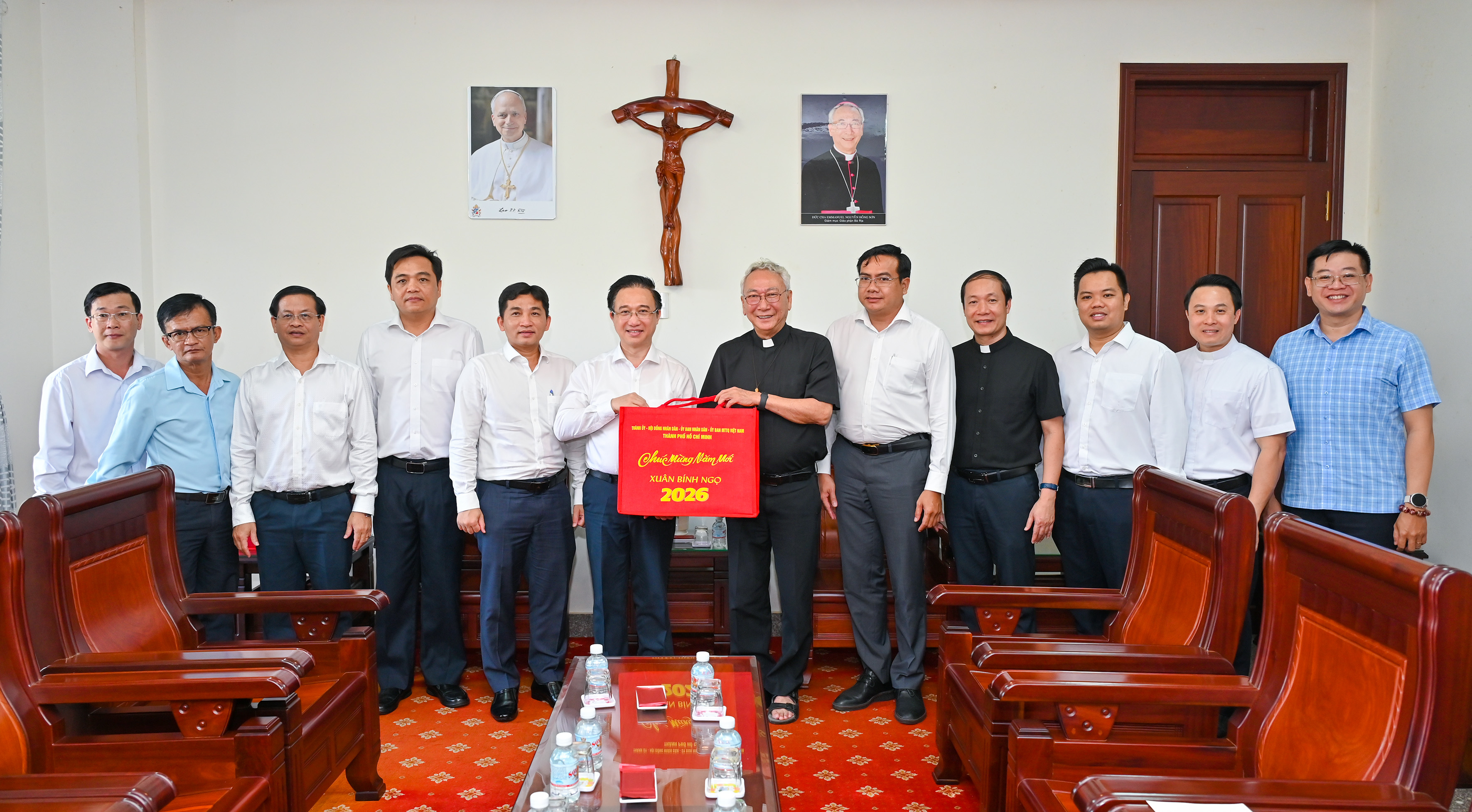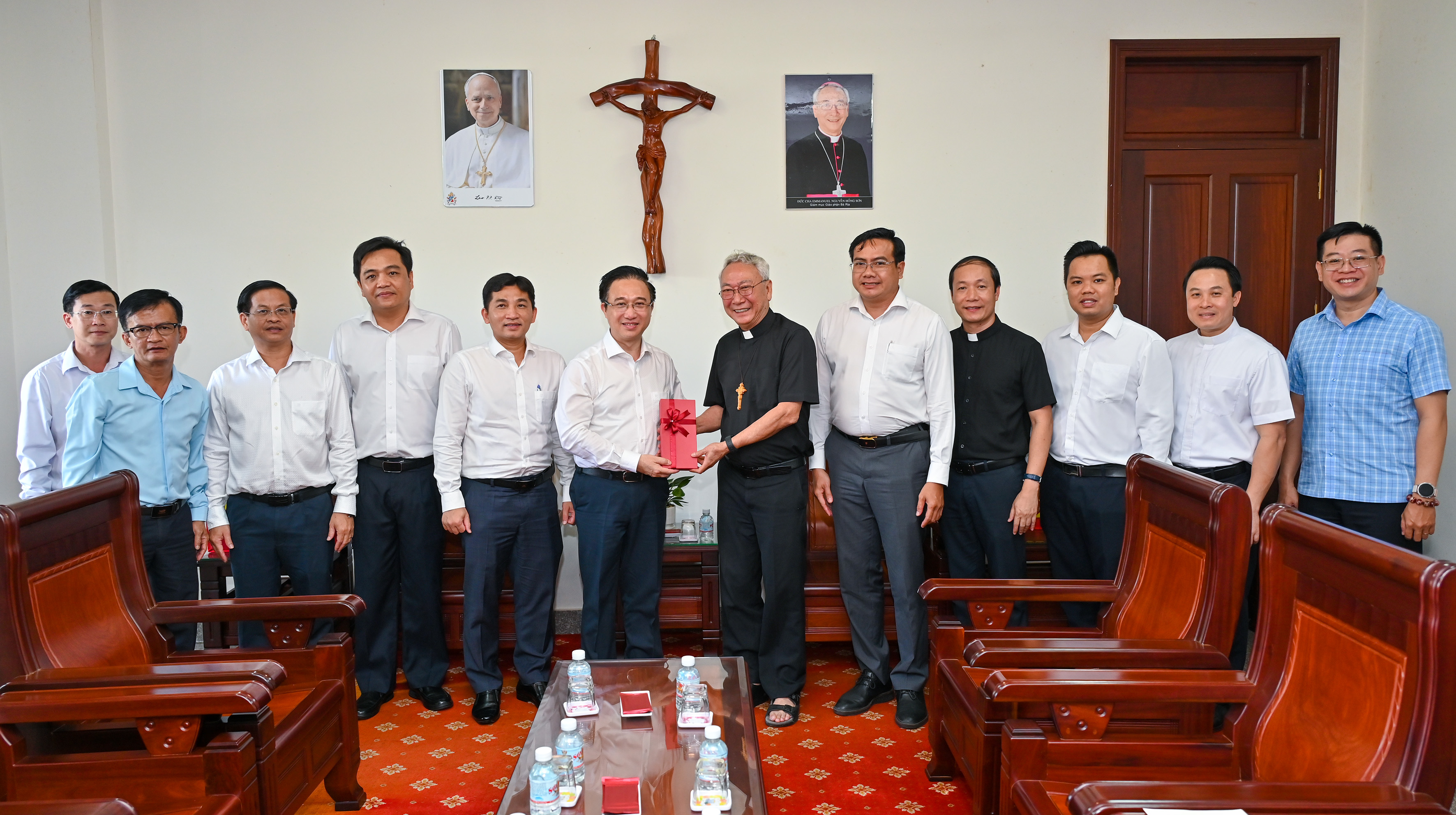 Giám mục Emmanuel Nguyễn Hồng Sơn tặng quà kỷ niệm đến lãnh đạo TPHCM