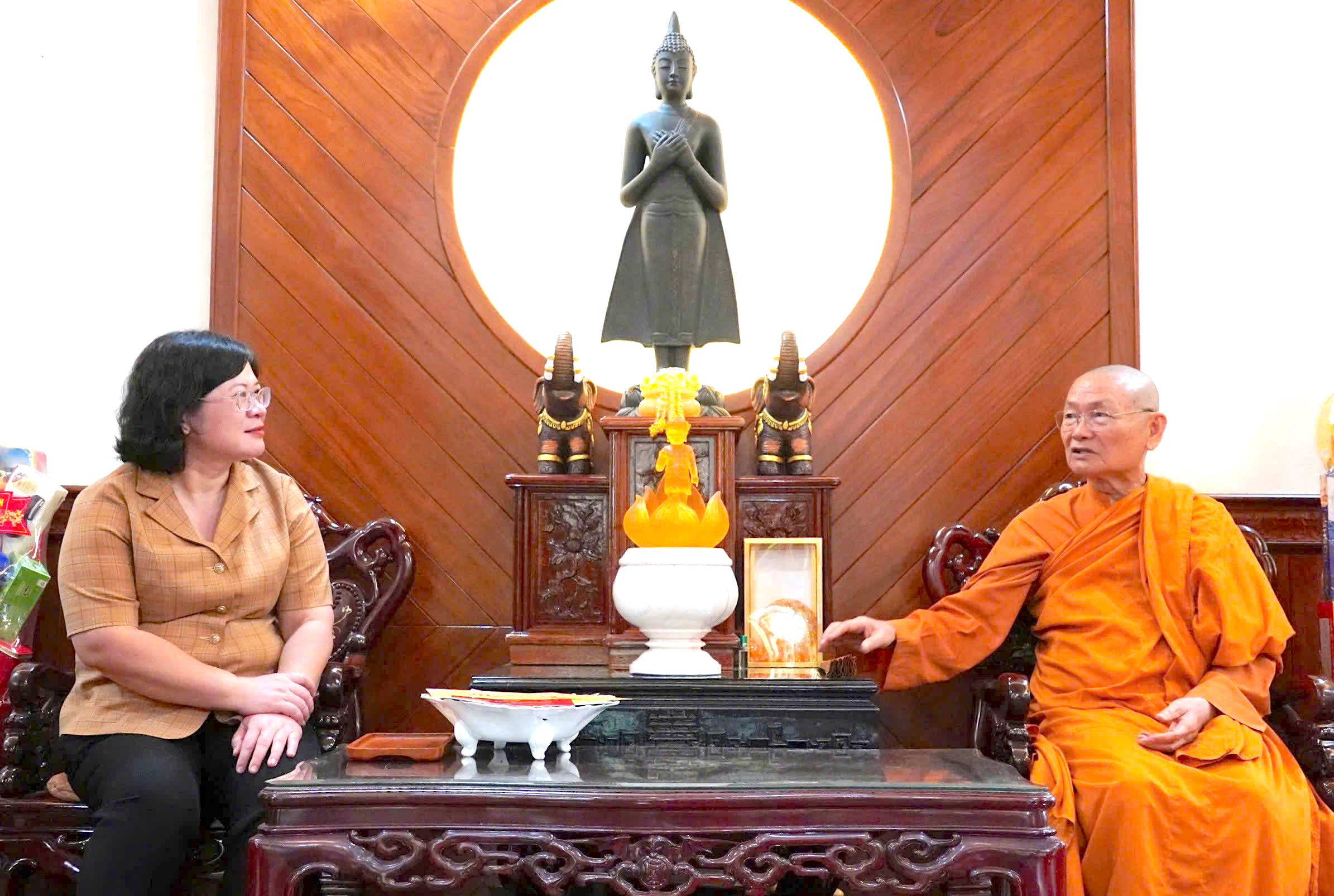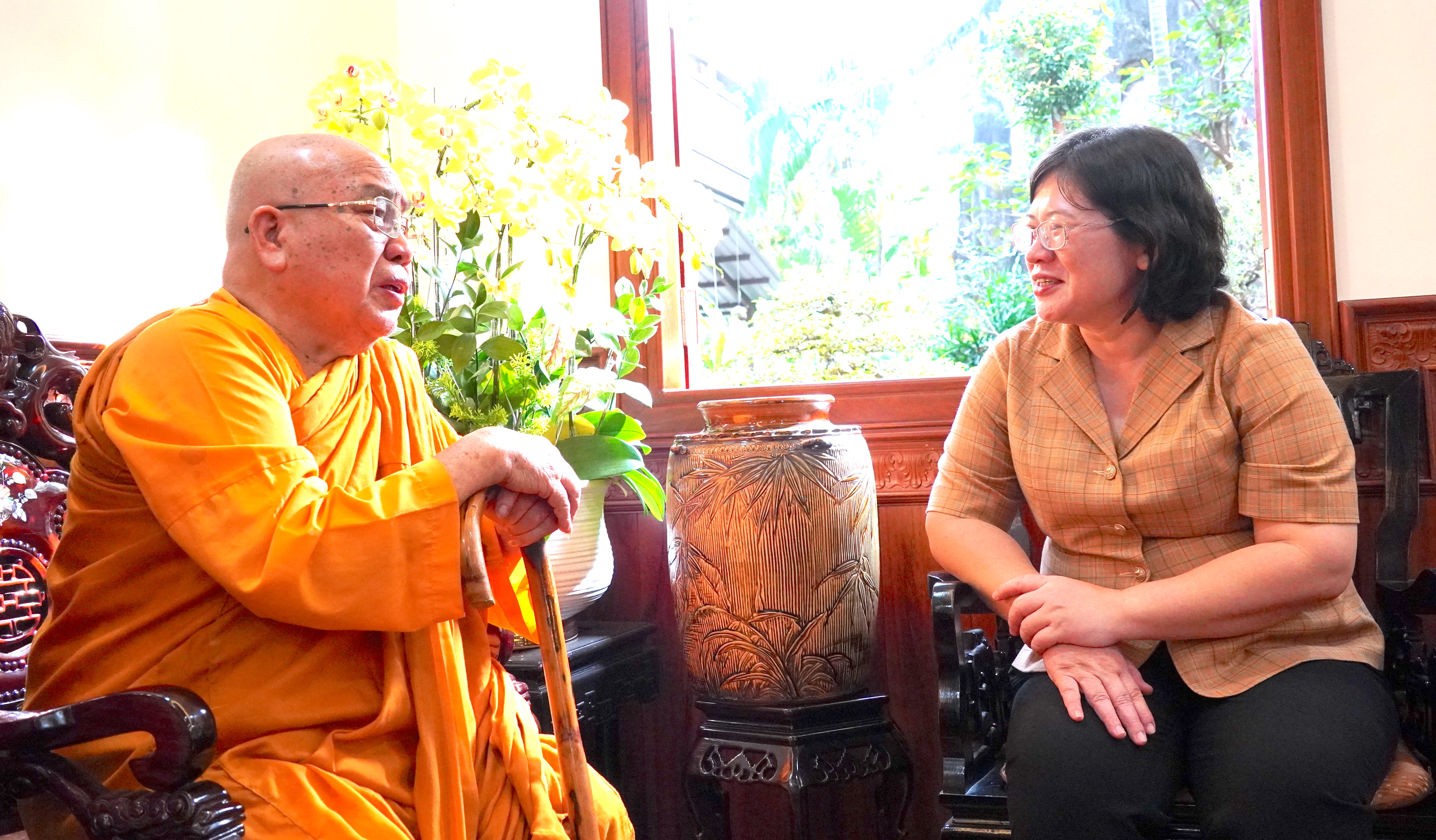 Đồng chí Văn Thị Bạch Tuyết trò chuyện cùng Hòa thượng Hộ Chánh