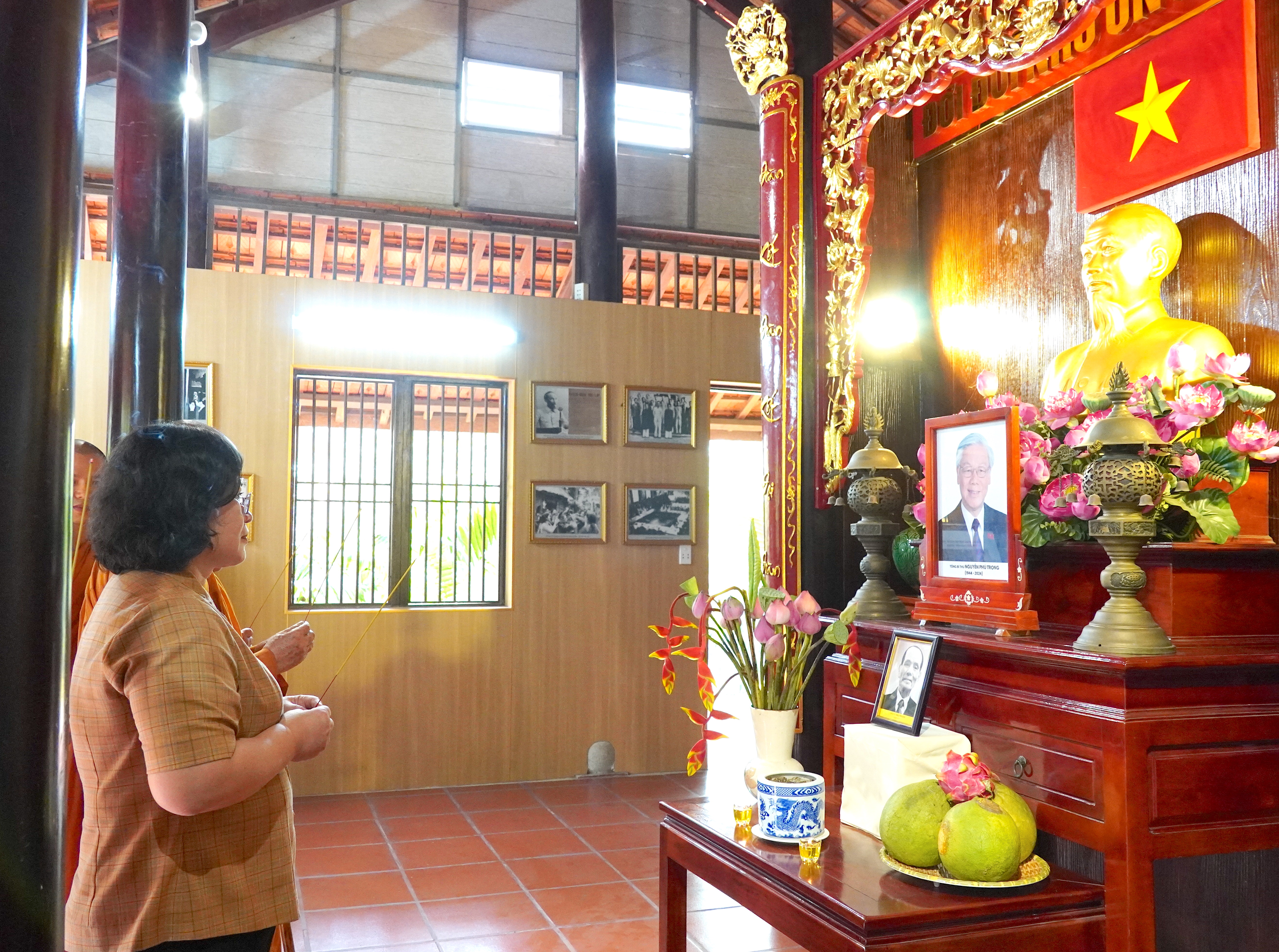 Đồng chí Văn Thị Bạch Tuyết dâng hương tưởng nhớ Chủ tịch Hồ Chí Minh và Tổng Bí thư Nguyễn Phú Trọng, tại Nhà tưởng niệm Bác Hồ trong khuôn viên chùa Bửu Long