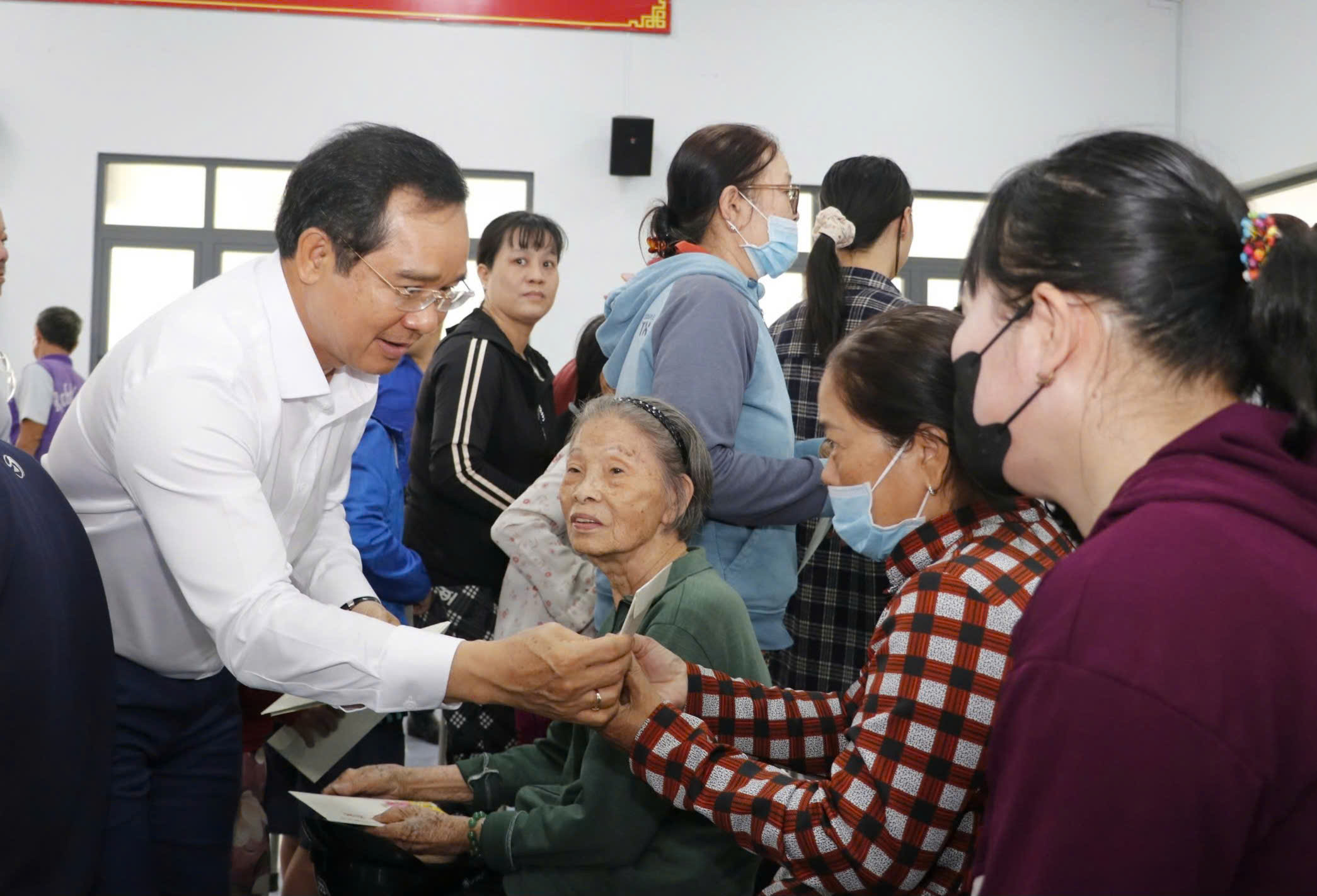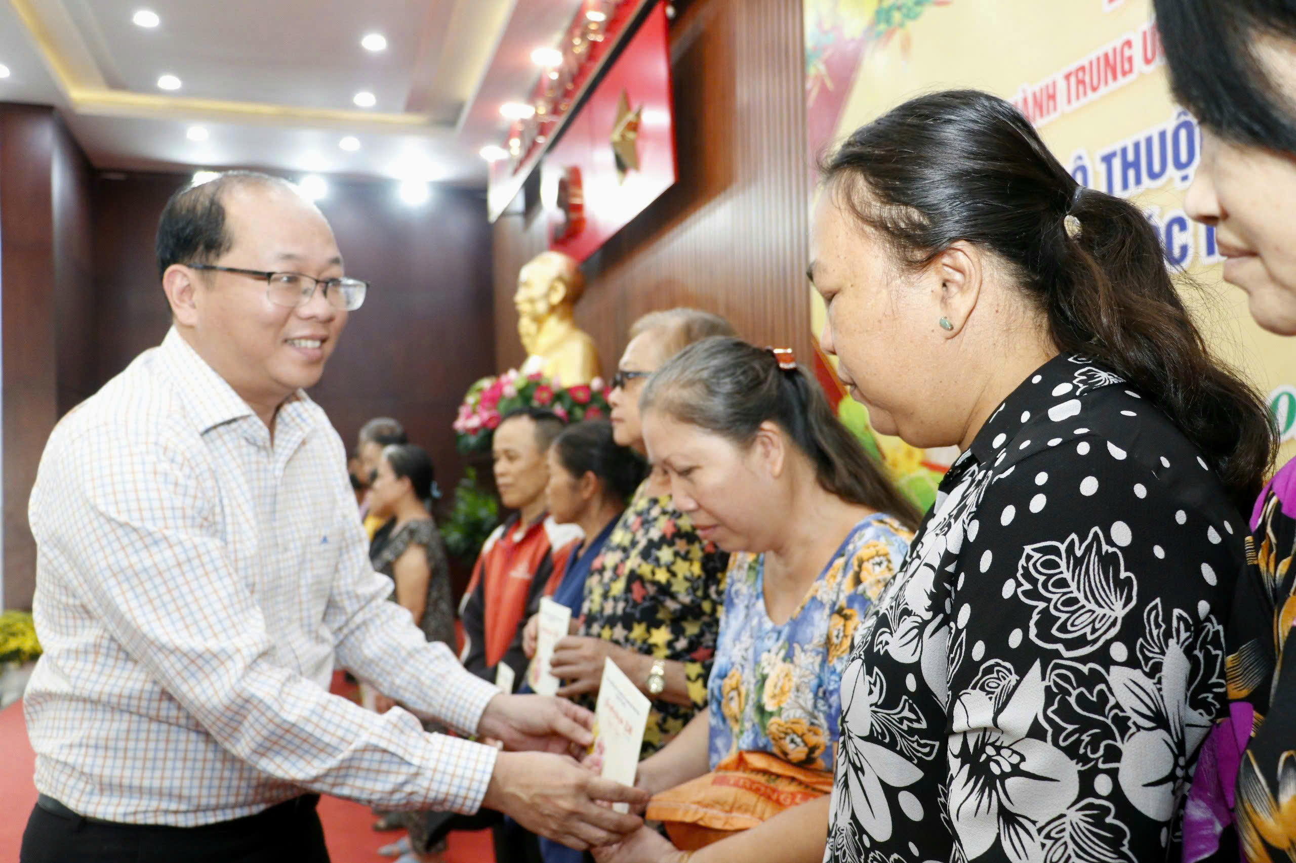 Chánh Văn phòng UBND TPHCM Dương Hồng Thắng trao quà tết đến người dân. Ảnh: NGÔ BÌNH