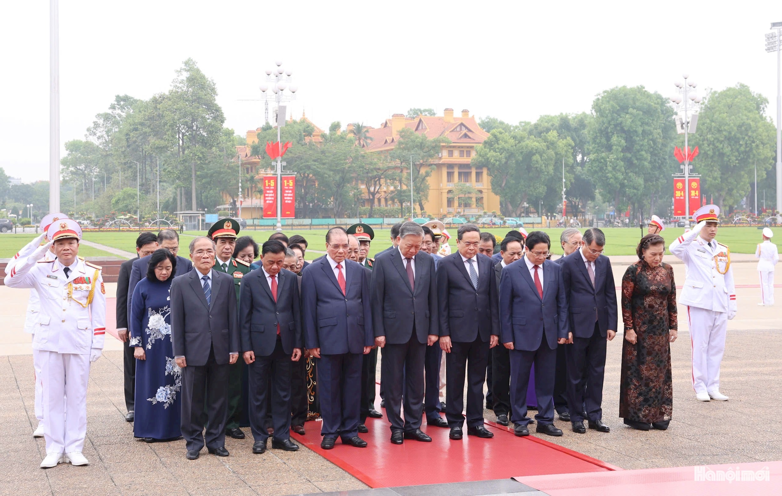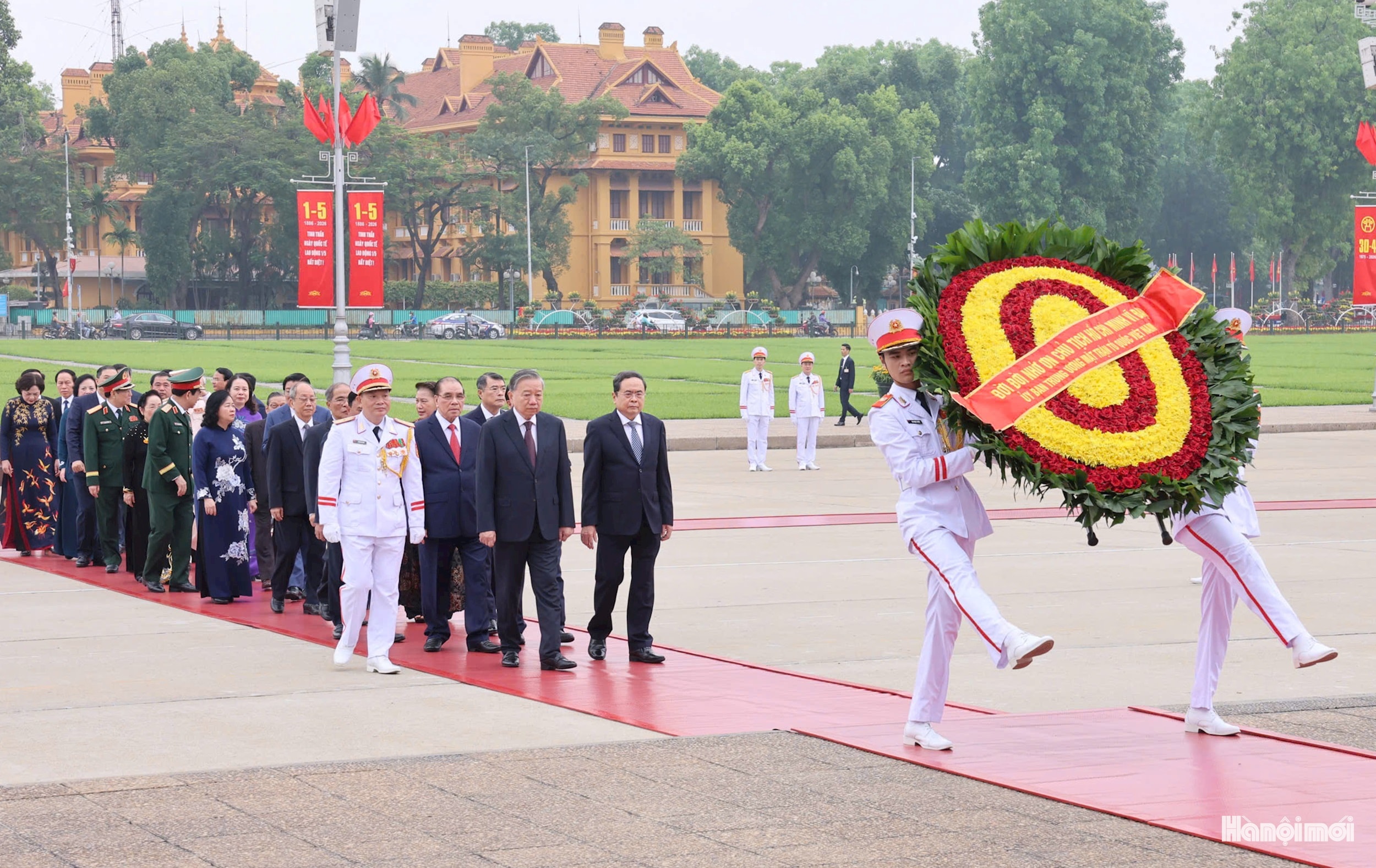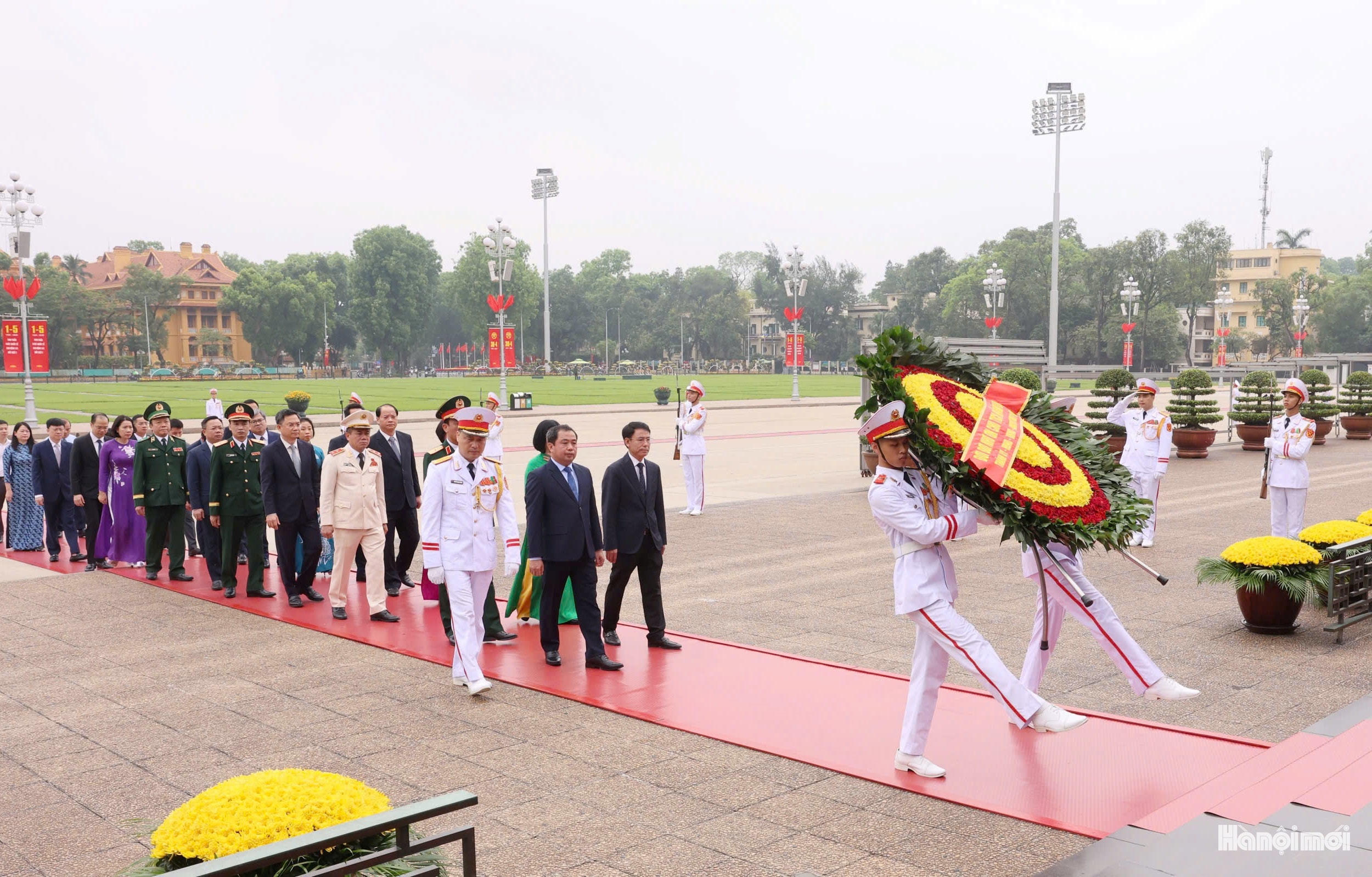 Các đồng chí lãnh đạo Đảng, Nhà nước đặt vòng hoa, vào Lăng viếng Chủ tịch Hồ Chí Minh. Ảnh: Viết Thành