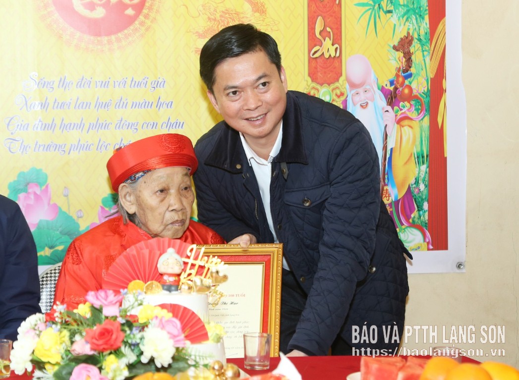 Đồng chí Đinh Hữu Học, Phó Chủ tịch Thường trực UBND tỉnh trao quà mừng thọ cụ Nguyễn Thị Biên, thôn Bản Nhàn, xã Tràng Định