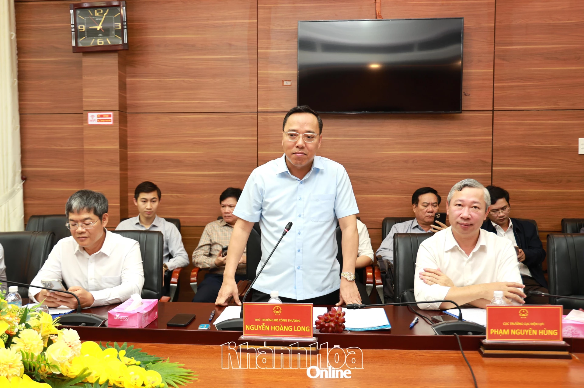 Phát biểu kết luận buổi làm việc, Thứ trưởng Bộ Công Thương Nguyễn Hoàng Long ghi nhận những nỗ lực của tỉnh Khánh Hòa trong việc thiết lập đầu mối trao đổi thường xuyên giữa tỉnh với các bộ phận chuyên môn của Bộ Công Thương. Thứ trưởng yêu cầu tỉnh và các chủ đầu tư đẩy nhanh tiến độ triển khai các dự án điện, đặc biệt là các dự án đã có chủ trương đầu tư. Trong đó, việc thực hiện nhanh Quy hoạch điện VIII (điều chỉnh) là nền tảng chuẩn bị cho việc nghiên cứu xây dựng Quy hoạch điện IX. Sau buổi làm việc, Bộ Công Thương sẽ có kết luận cụ thể các nội dung làm việc.