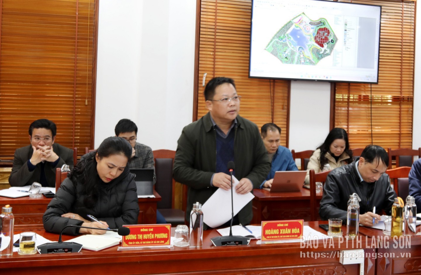 Lãnh đạo UBND xã Chi Lăng báo cáo phương án đầu tư xây dựng một số hạng mục, công trình tại đền Chi Lăng và khu đập Bãi Hào tại buổi làm việc