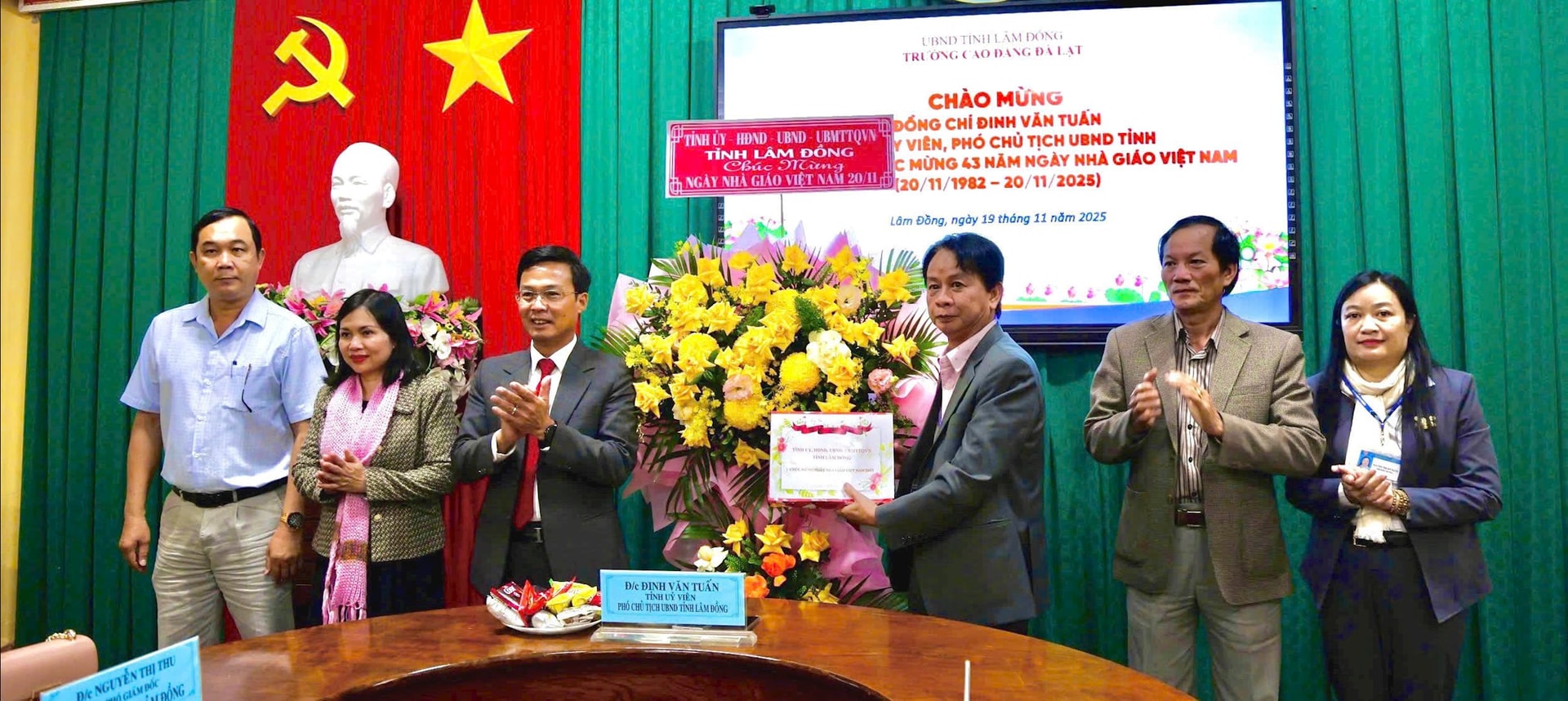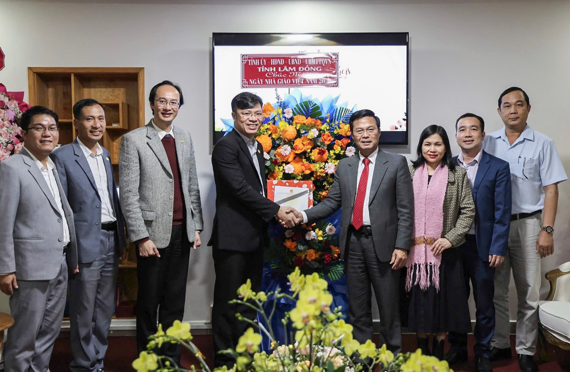 Phó Chủ tịch UBND tỉnh Đinh Văn Tuấn và lãnh đạo các sở ngành tặng hoa, quà chúc mừng tại Đại học Yersin Đà Lạt