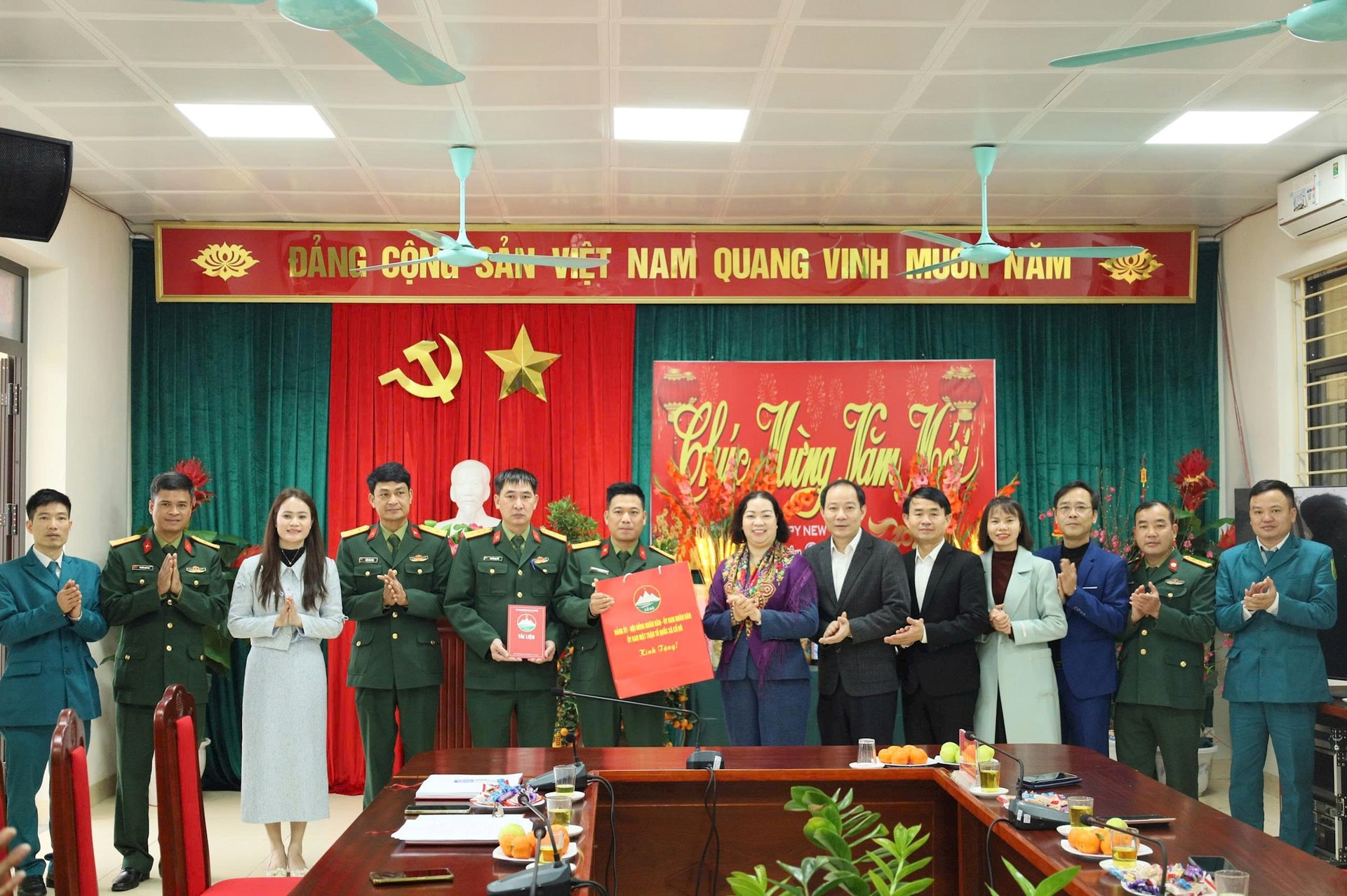 Lãnh đạo xã Cổ Đô thăm, chúc Tết, tặng quà Ban Chỉ huy quân sự xã nhân dịp Tết Nguyên đán. Ảnh: Hồng Đạt