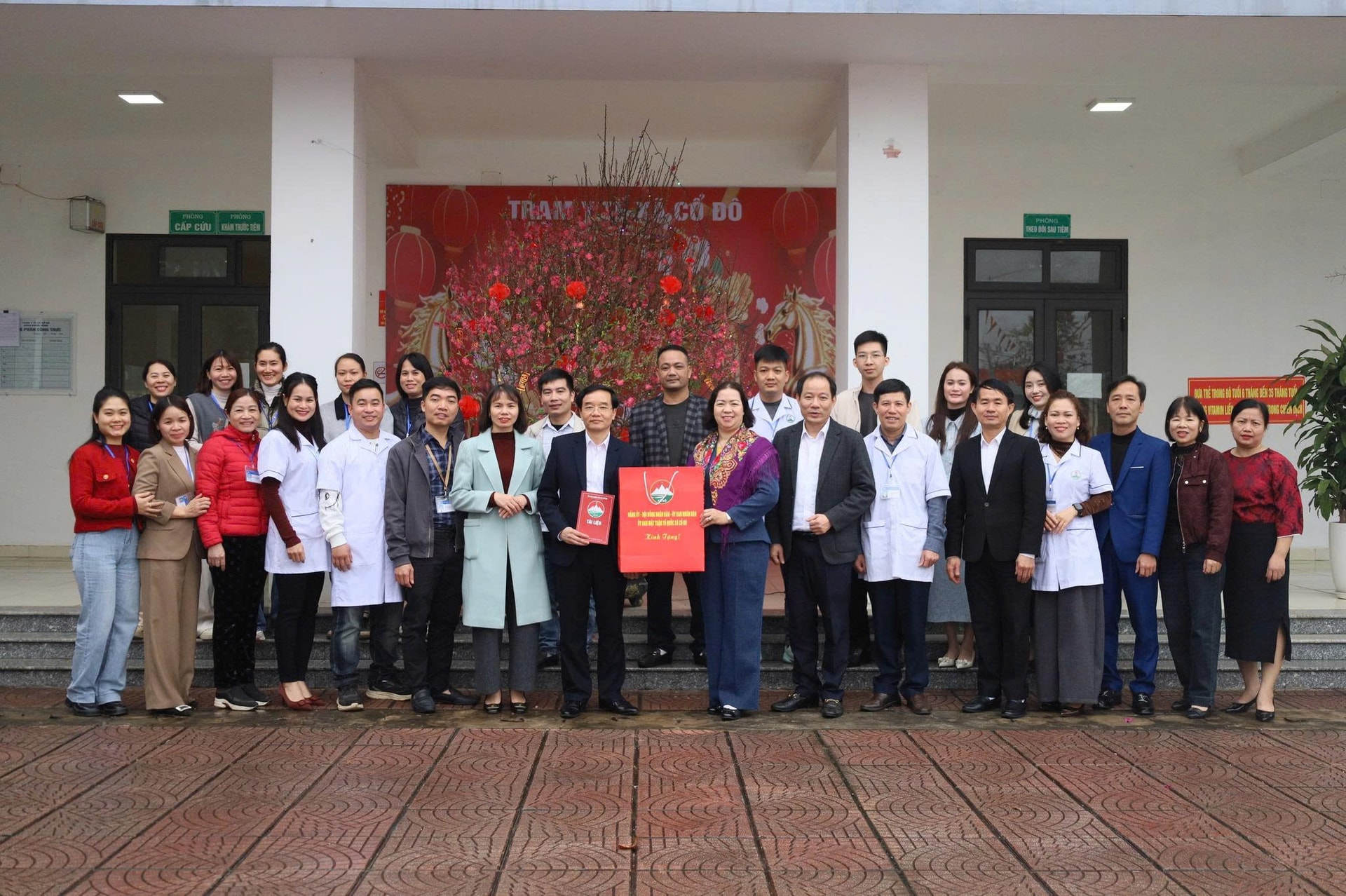 Lãnh đạo xã Cổ Đô thăm, chúc tết, tặng quà Trạm Y tế xã nhân dịp Tết nguyên đán. Ảnh: Hồng Đạt