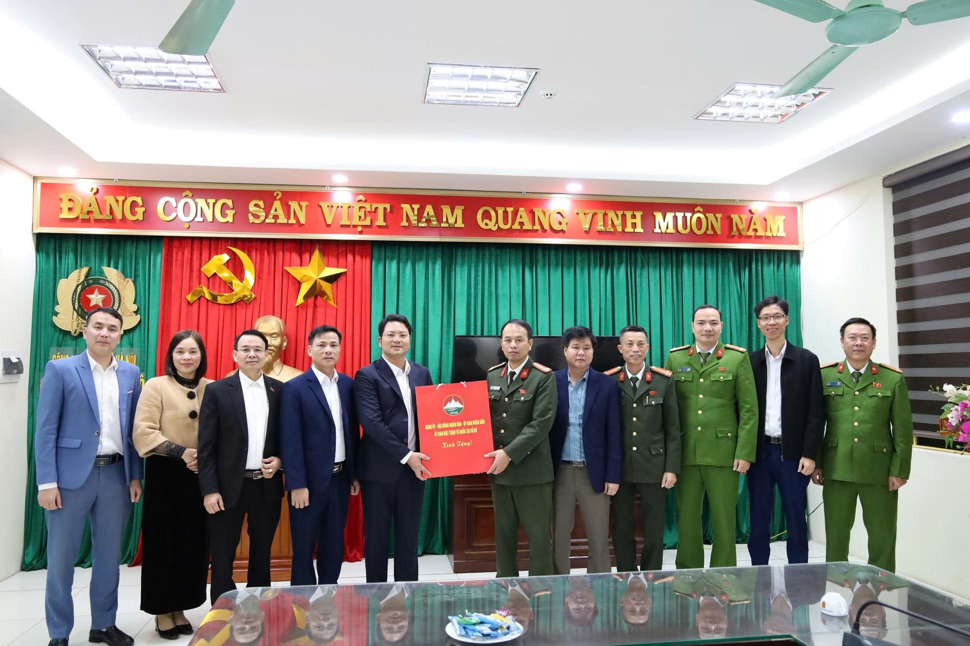 Lãnh đạo xã Cổ Đô thăm, chúc Tết, tặng quà Công an xã nhân dịp Tết nguyên đán. Ảnh: Hồng Đạt