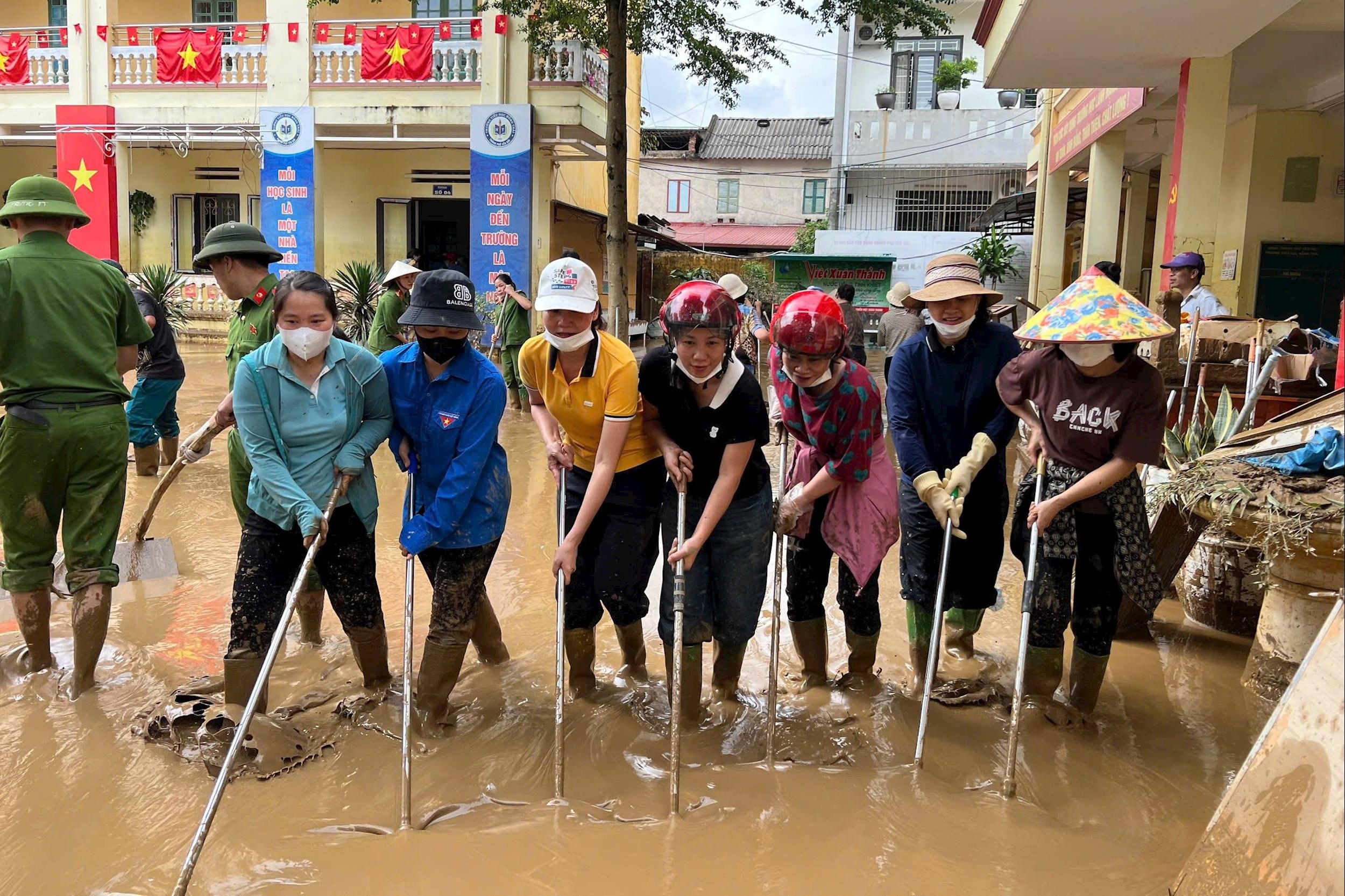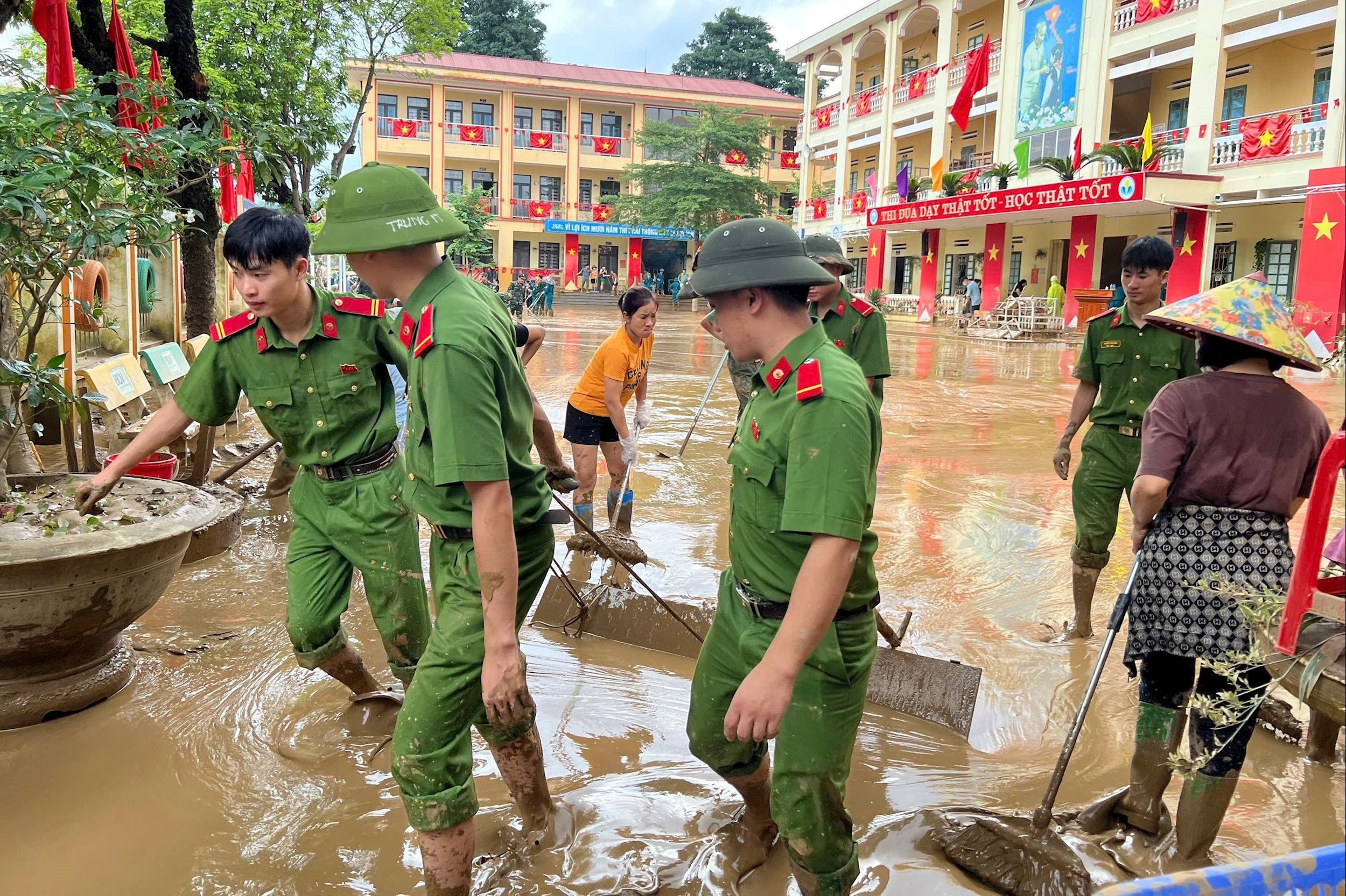 Nỗ lực khắc phục hậu quả bão số 10, sau khi nước rút tại trường THCS Mỏ Vàng, xã Mỏ Vàng, tỉnh Lào Cai. Ảnh: laocai.gov