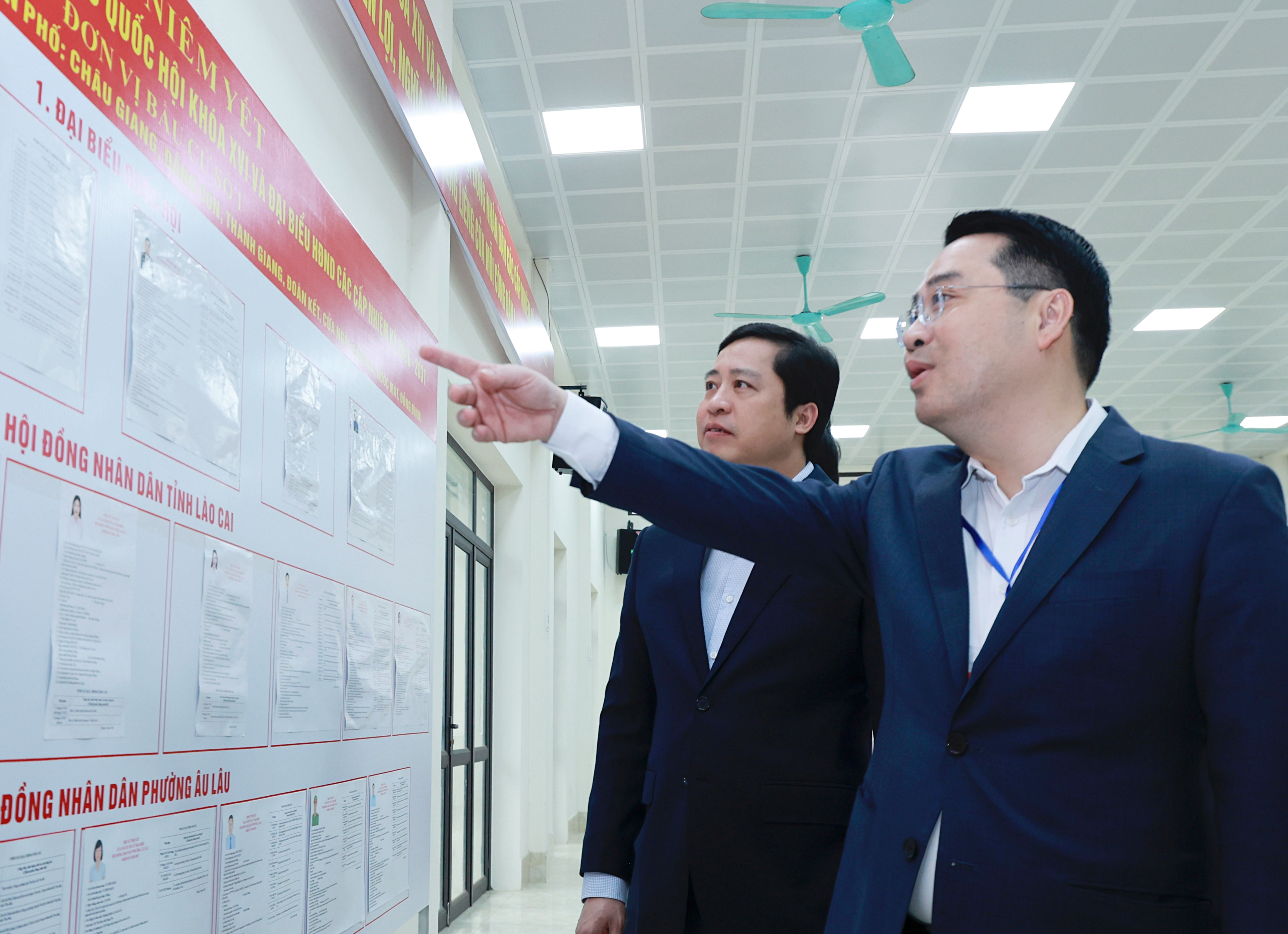 Đoàn công tác kiểm tra khu vực niêm yết danh sách ứng cử viên.