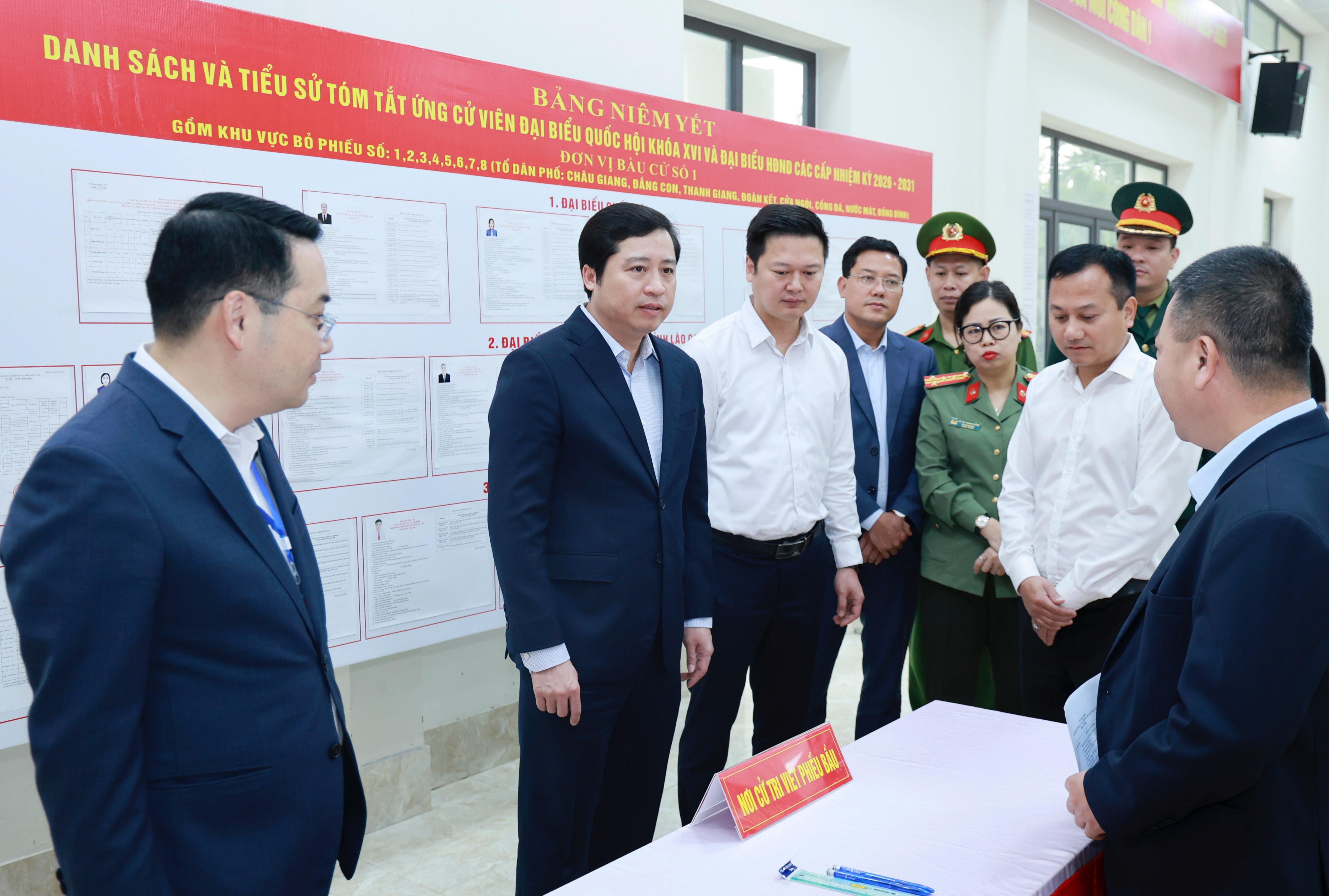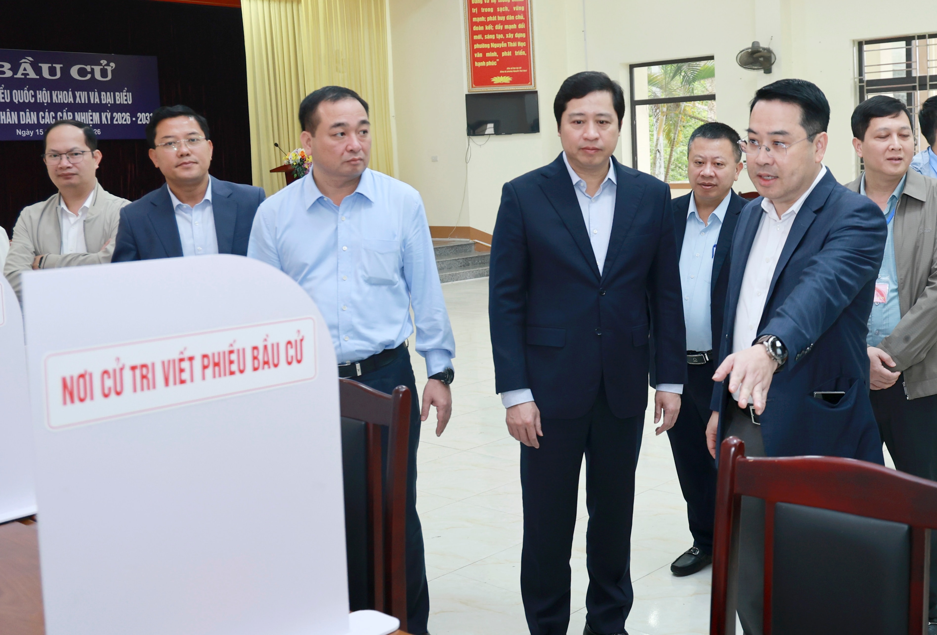 Đoàn công tác kiểm tra khu vực viết phiếu bầu cử.