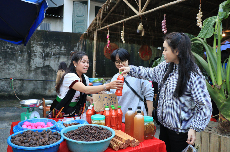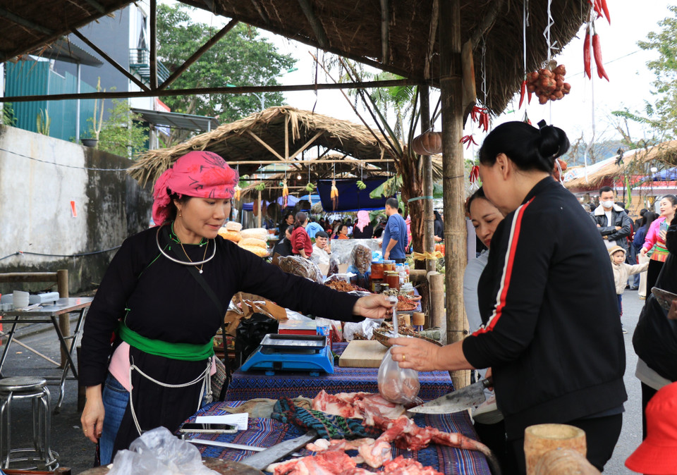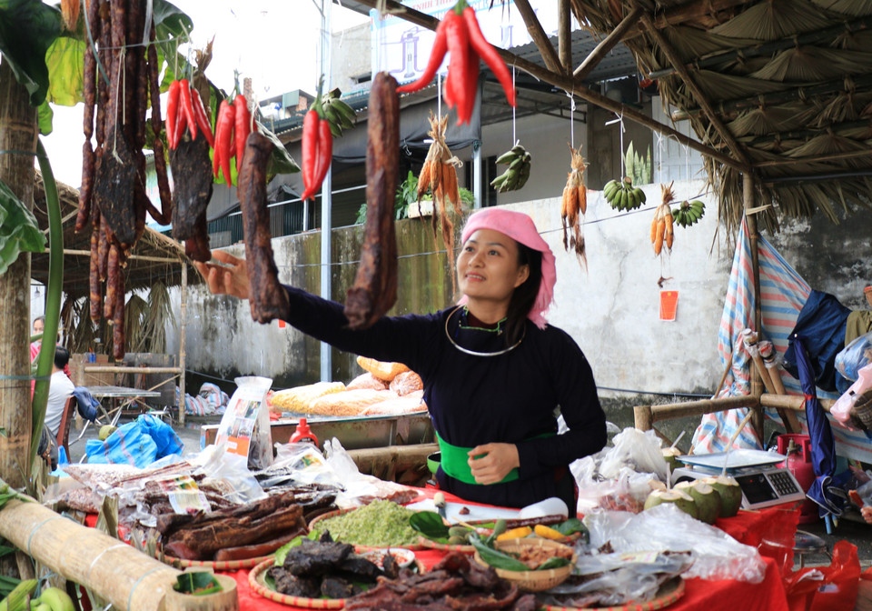 Những sản vật của địa phương được du khách ưa chuộng tại không gian tái hiện chợ Cốc Lếu xưa. (Ảnh: Tuấn Anh/TTXVN)