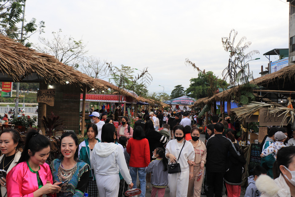 Đông đảo người dân và du khách tham quan, mua sắm, thưởng thức ẩm thực và chụp ảnh tại khu vực tái hiện chợ Cốc Lếu xưa. (Ảnh: Tuấn Anh/TTXVN)