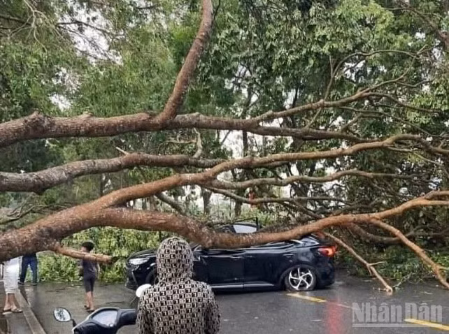 Cây xanh bật gốc đè trúng một ô-tô trên Quốc lộ 37.