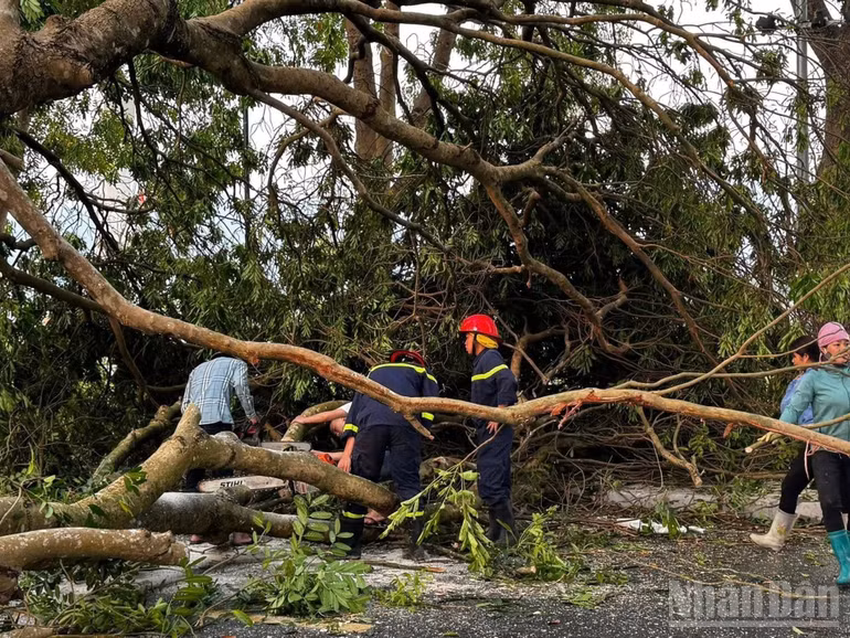 Nhân dân phường Cầu Thia cùng nhau dọn dẹp cây đổ sau dông, lốc. (Ảnh: THANH SƠN)