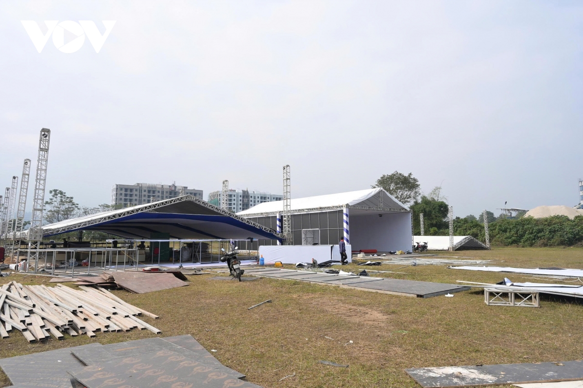 Trong khu vực quy hoạch Quảng trường ga Lào Cai mới (thuộc phường Lào Cai), các đơn vị sự kiện đang hối hả hoàn tất việc lắp đặt nhà bạt và sân khấu hoành tráng trên khu đất rộng 6,8 ha đã được san gạt bằng phẳng.