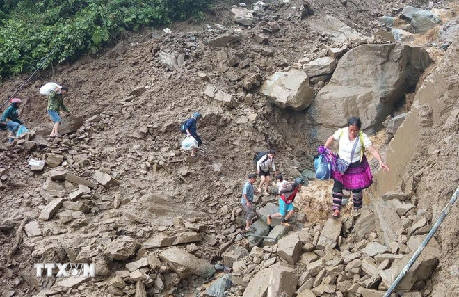 Người dân đi bộ qua khu vực sạt lở tại đèo Khau Phạ. (Ảnh: TTXVN phát)