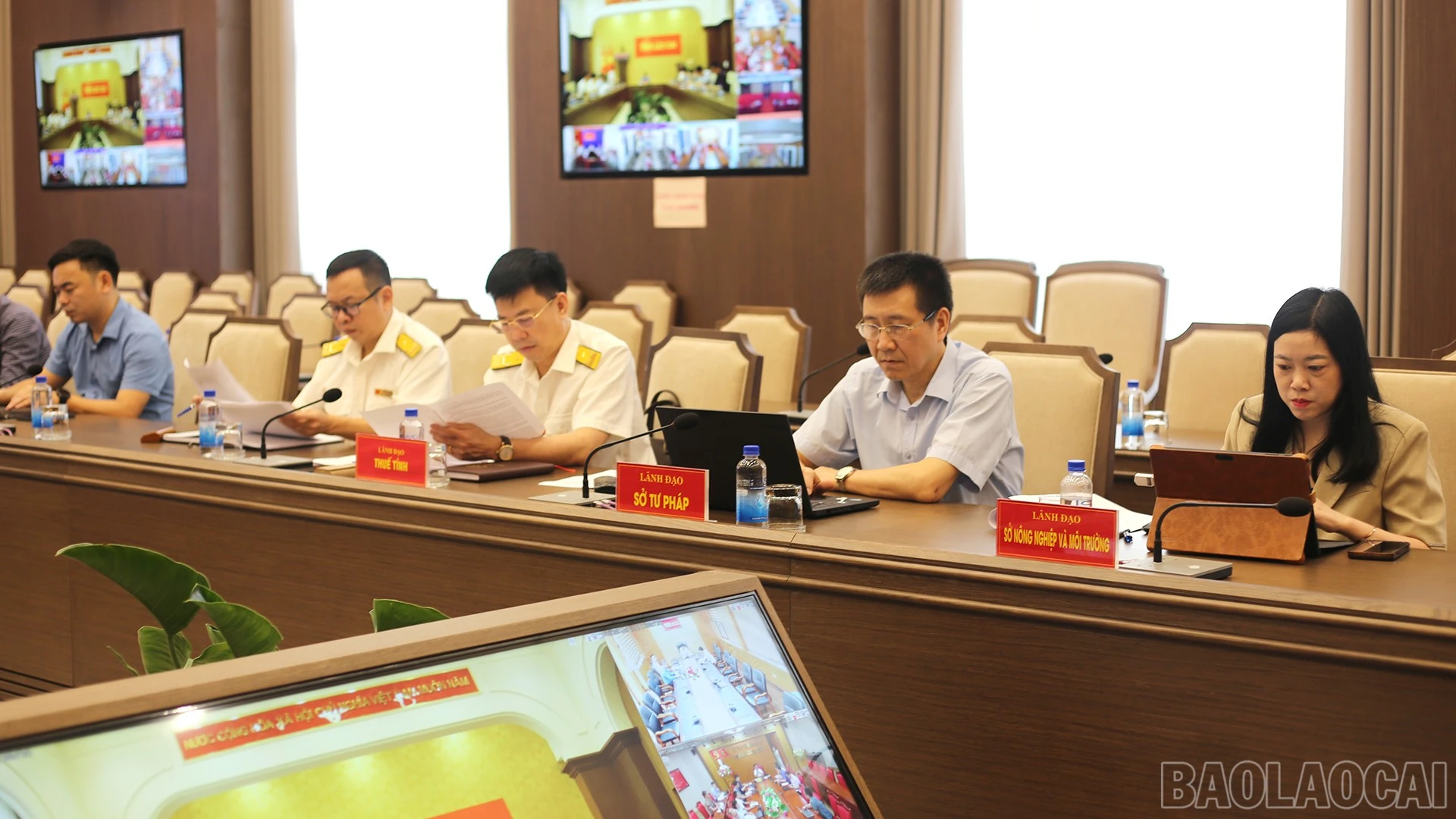 Lãnh đạo các sở, ngành tham dự cuộc họp tại điểm cầu UBND tỉnh.