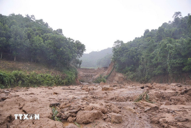 Hiện trường nơi ao cá bị vỡ. (Ảnh: TTXVN phát)