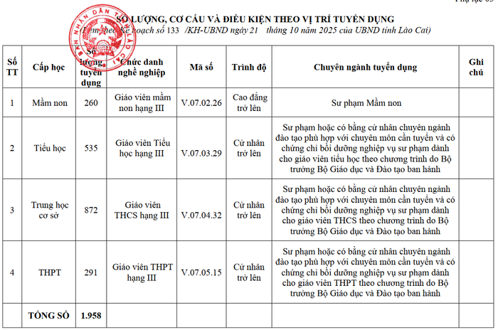Theo Kế hoạch, tổng số vị trí cần tuyển là 1.958 chỉ tiêu, tập trung chủ yếu ở các trường mầm non, tiểu học và trung học cơ sở trên địa bàn tỉnh.