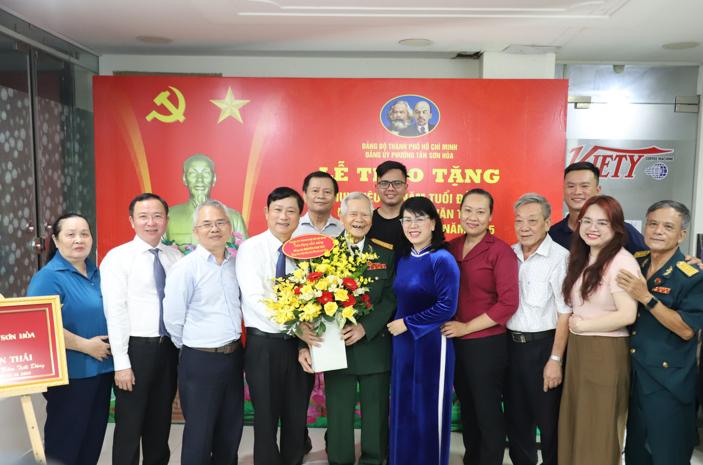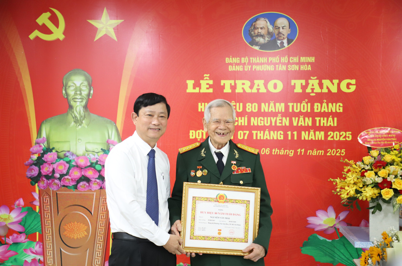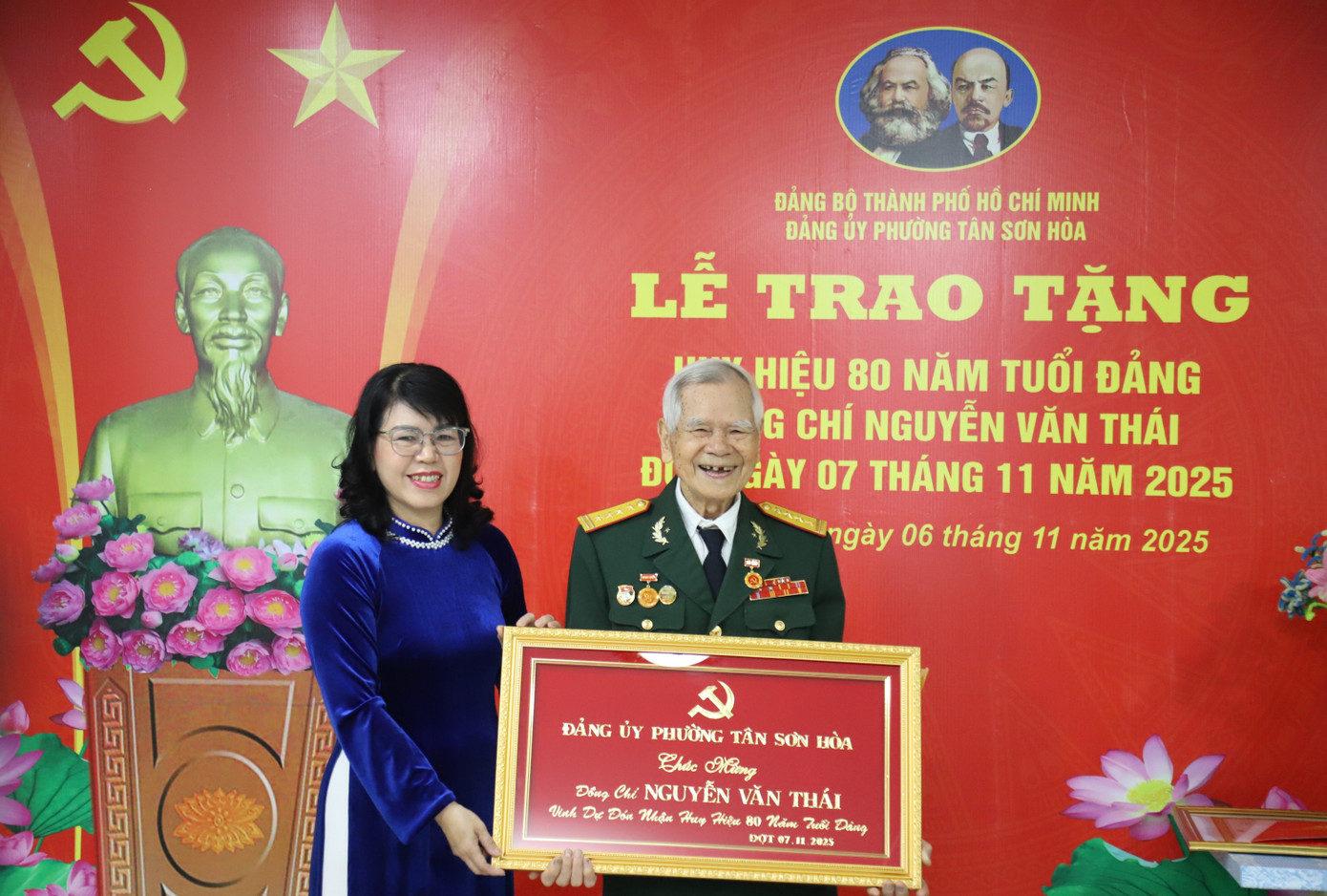 Chiều 6/11, Đảng ủy phường Tân Sơn Hòa (TPHCM) tổ chức Lễ trao tặng Huy hiệu 80 năm tuổi Đảng cho cụ Nguyễn Văn Thái, đảng viên Chi bộ khu phố 27, phường Tân Sơn Hòa.