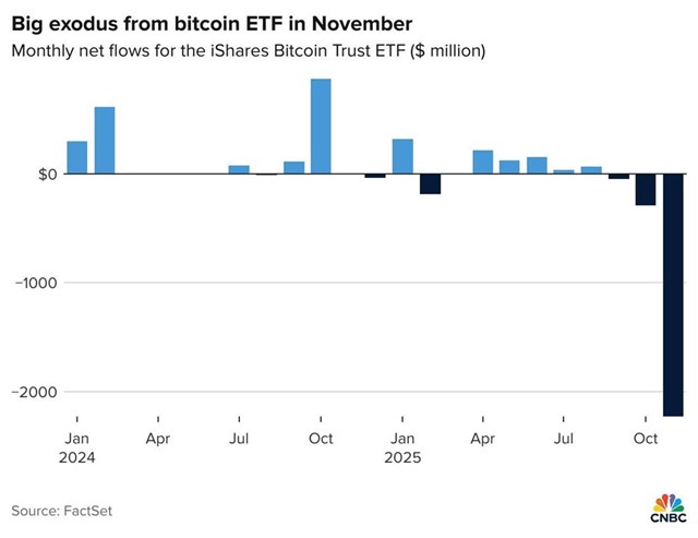 Theo dữ liệu FactSet tính đến ngày 24/11, quỹ iShares Bitcoin Trust (IBIT) đã ghi nhận 2,2 tỷ USD bị rút ròng trong tháng này. Con số này gần gấp 8 lần mức 291 triệu USD rút ra hồi tháng 10 năm ngoái, thời điểm tồi tệ thứ hai kể từ khi quỹ vận hành đầu năm 2024.