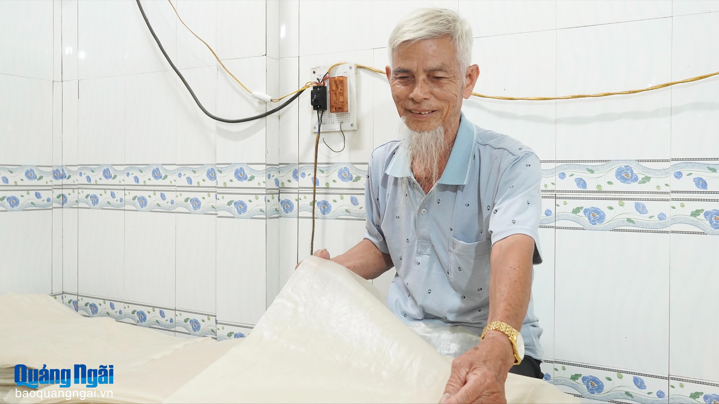 Ông Dương Hồng Sen kiểm tra chất lượng bánh tráng trước khi cho vào máy cắt sợi thành hủ tiếu.