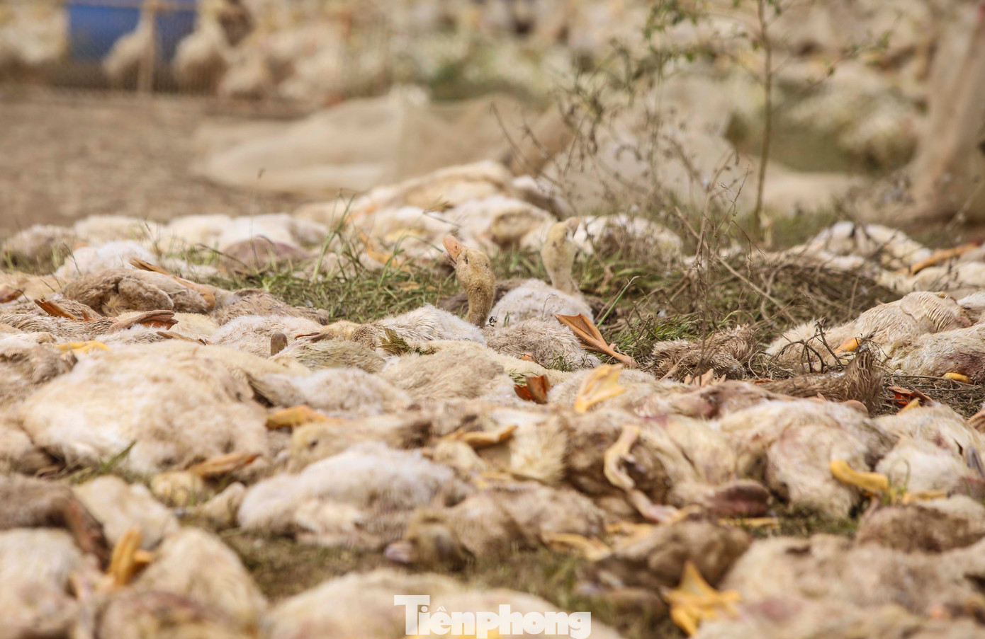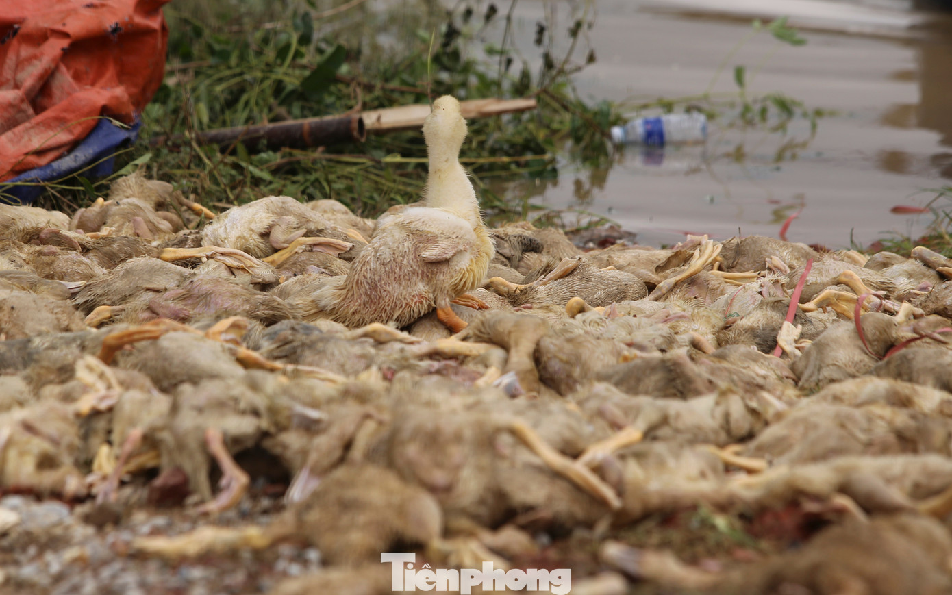 Đàn vịt chết đã bốc mùi đang được gia đình ông Kiều thu dọn. Số vịt còn sót được đưa lên bờ đê.