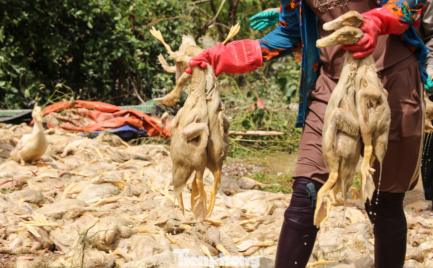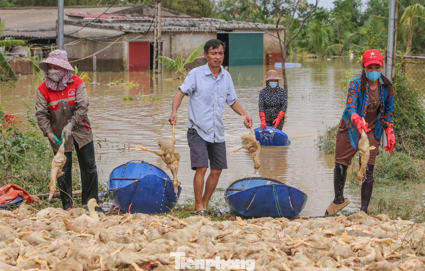 Sáng 1/10, khi dòng lũ đục ngầu đang dần rút, ông Kiều cùng các con và một số người dân thôn Phú Nhi (xã Vạn Lộc) lại ngâm mình trong làn nước lạnh, lội vào khu trang trại rộng 3.000 m² để vớt từng xác vịt ra bờ đê tiêu hủy, tránh ô nhiễm môi trường.
