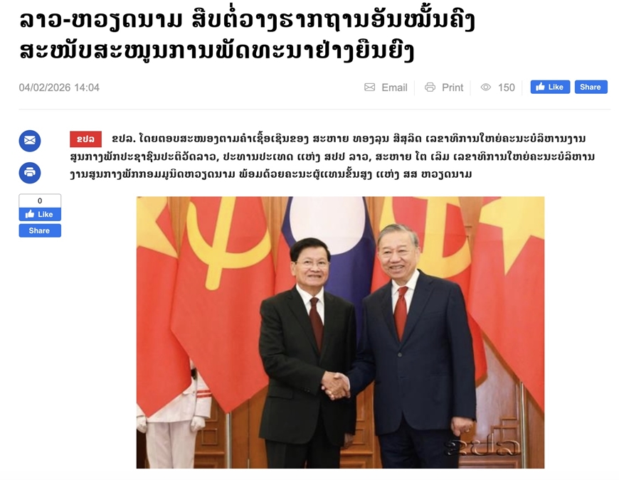 Bài viết ca ngợi quan hệ hữu nghị đặc biệt Việt Nam - Lào đăng trên trang Thông tấn xã Lào (KPL). Ảnh chụp màn hình.