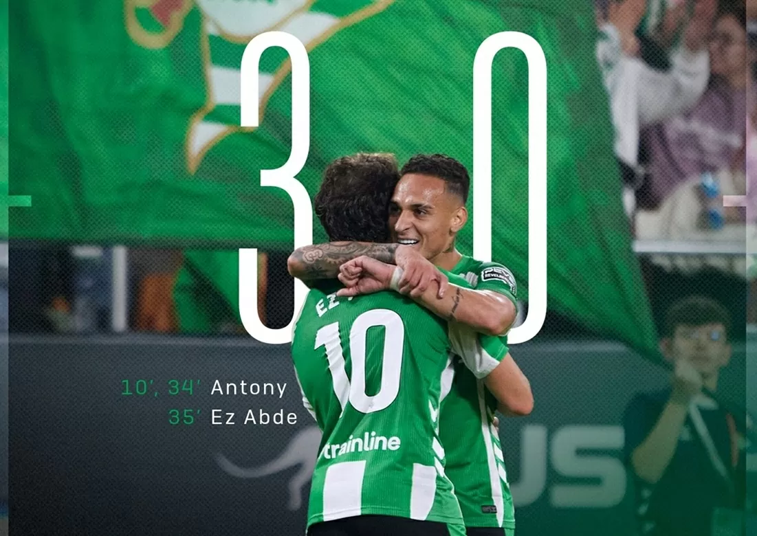 Trong ngày thi đấu chói sáng, Antony tham gia vào cả 3 bàn thắng của Betis. Phút thứ 10, sau pha phối hợp 1-2 với Cucho Hernandez, tuyển thủ Brazil tung cú sút từ ngoài vòng cấm, ghi bàn mở tỷ số cho đội chủ nhà.
