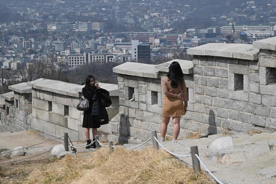 Du khách chụp ảnh dọc theo bức tường thành tại công viên Naksan (Seoul) - địa điểm xuất hiện trong một cảnh phim "Kpop demon hunters". (Ảnh: The Straits Times).
