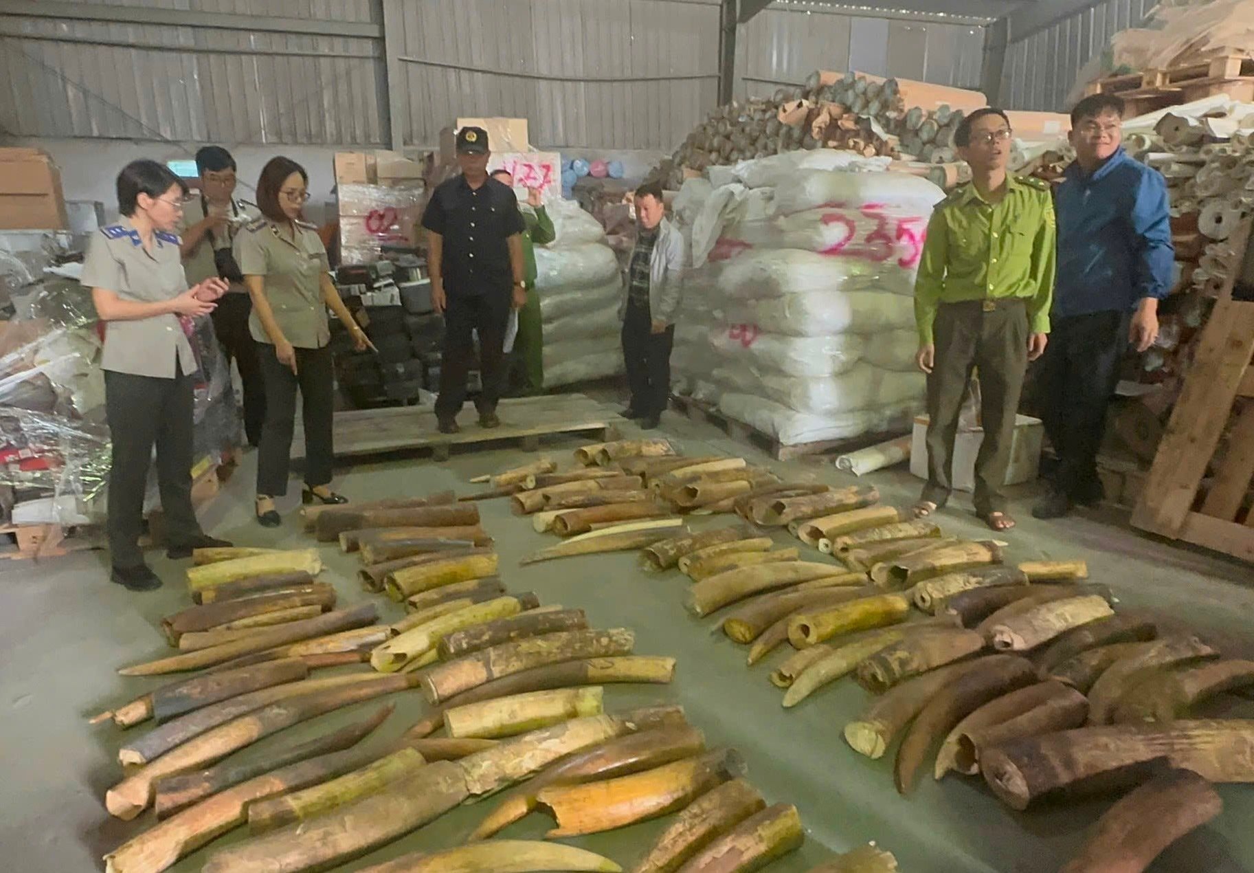Lực lượng chức năng kiểm đếm số tang vật trong vụ án “Vi phạm quy định về bảo vệ động vật nguy cấp, quý, hiếm”.