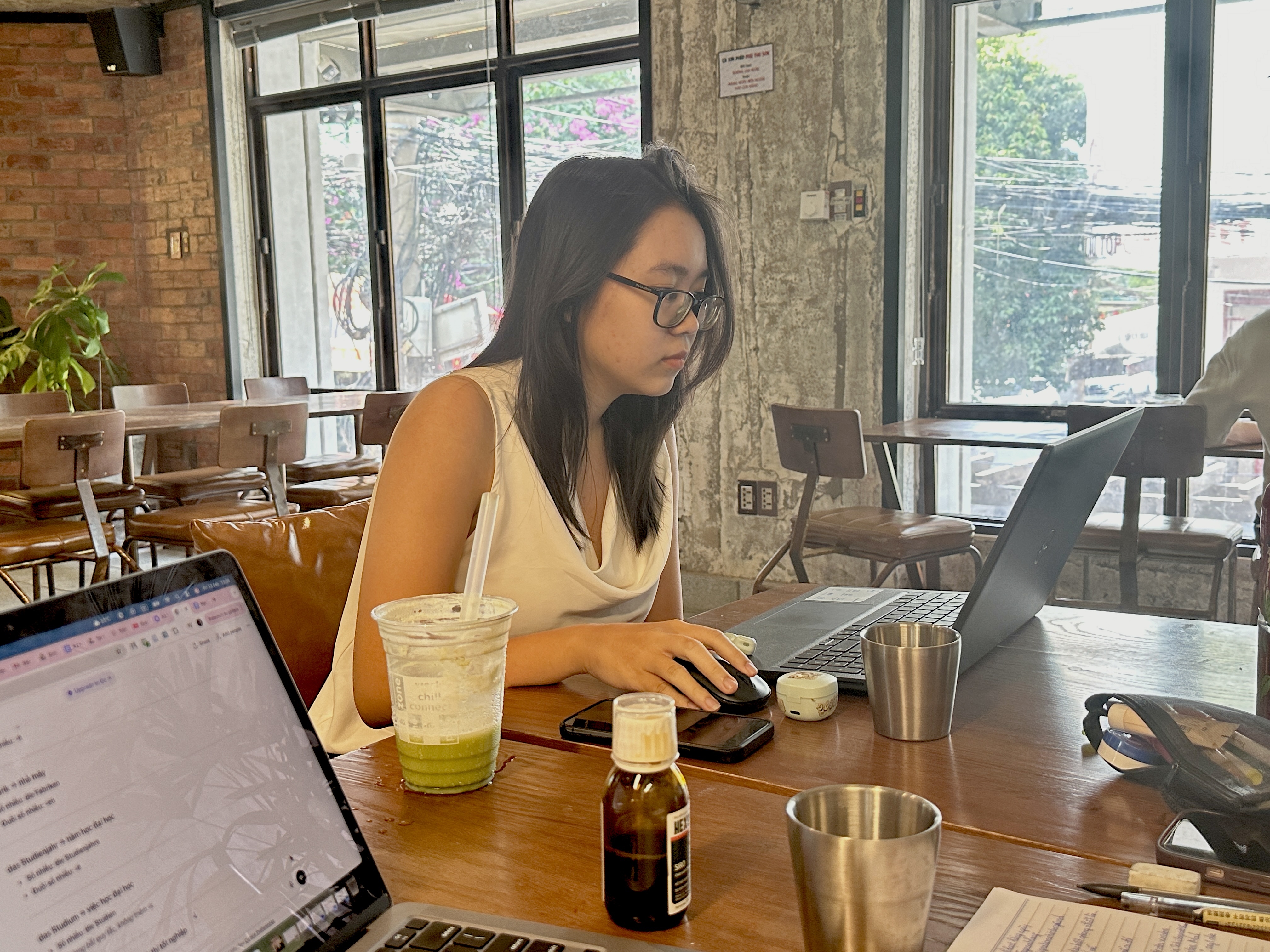 Có mặt tại quán từ 9h30, Hoàng Anh liên tục chỉnh sửa nội dung, hoàn thiện proposal và phản hồi email khách hàng. Đến trưa, cô chỉ ghé cửa hàng tiện lợi gần đó mua nhanh bữa ăn rồi quay lại bàn làm việc. "Tôi xác định hôm nay sẽ ở đây đến 20h, làm xong hết mới về", cô nói.