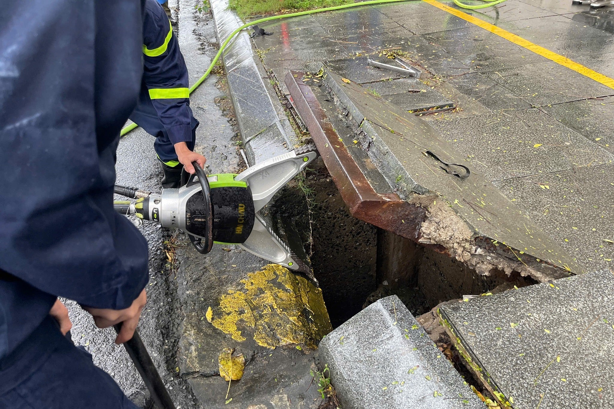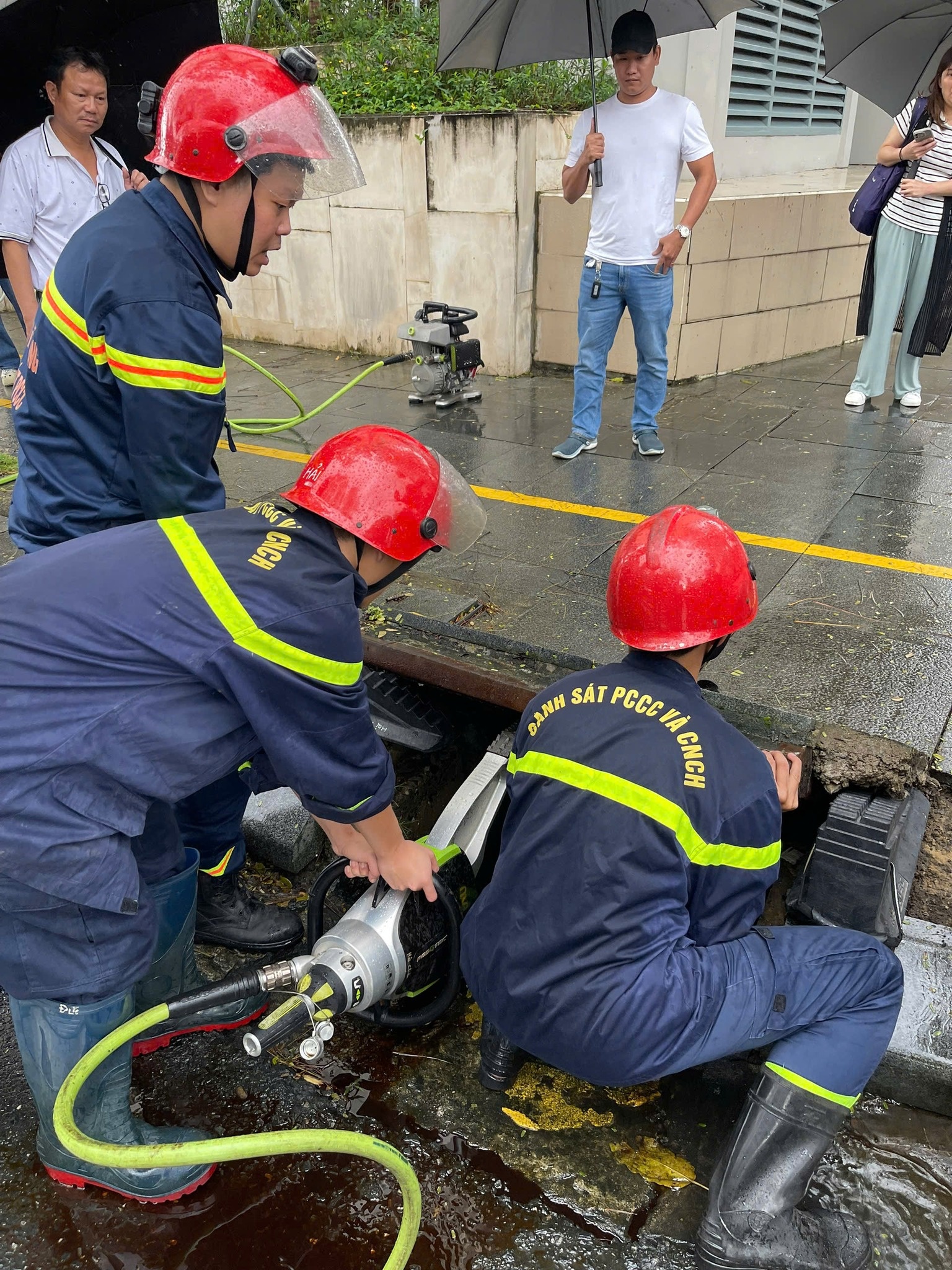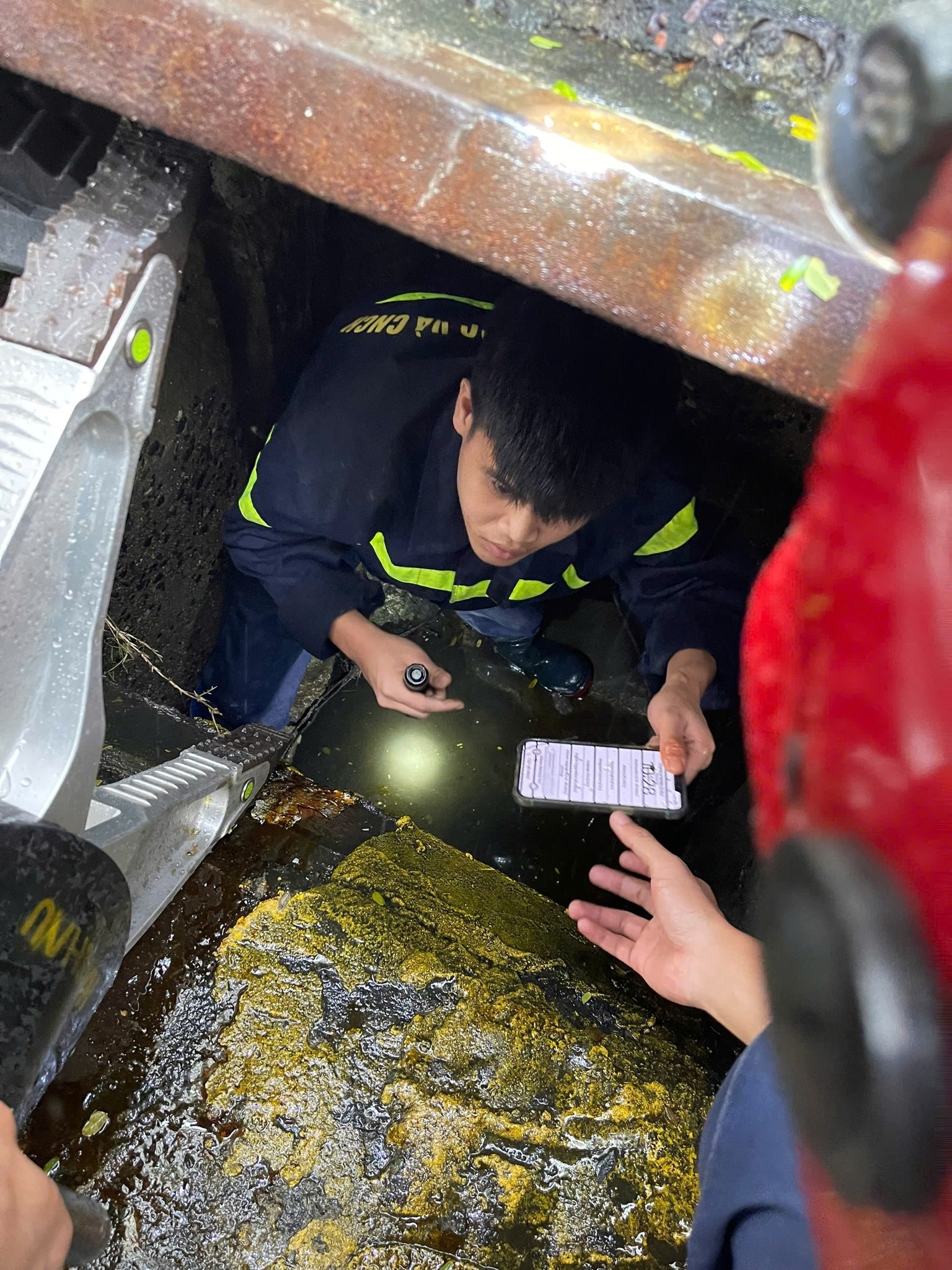 Cảnh lực lượng Cảnh sát Phòng cháy chữa cháy và Cứu nạn cứu hộ xuống cống sâu tìm điện thoại cho nữ du khách.